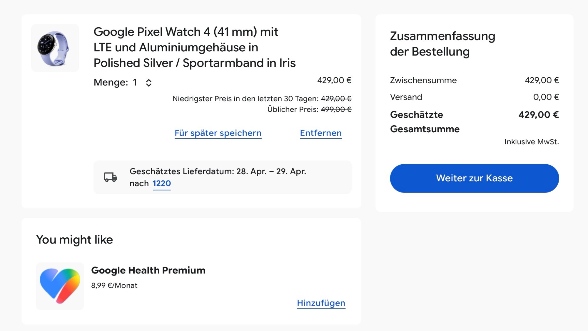 Şu anda Google'ın Çevrimiçi Mağazasında alışveriş sepetine bir Pixel Watch 4 eklersenizgoogle, bu yeni "Google Health Premium" aboneliğini aylık 8,99 € fiyatla öneriyor. 9to5Google keşfedilen abonelik, Fitbit uygulamasında aylık 9,99 ABD doları veya yıllık 99,99 ABD doları olarak listelenmiştir. Dolayısıyla yıllık abonelik Fitbit Premium'dan 20 dolar daha pahalı. Google Health Premium'un Fitbit Premium'a ek olarak mı yoksa onun yerini almak üzere mi tasarlandığı henüz bilinmiyor.