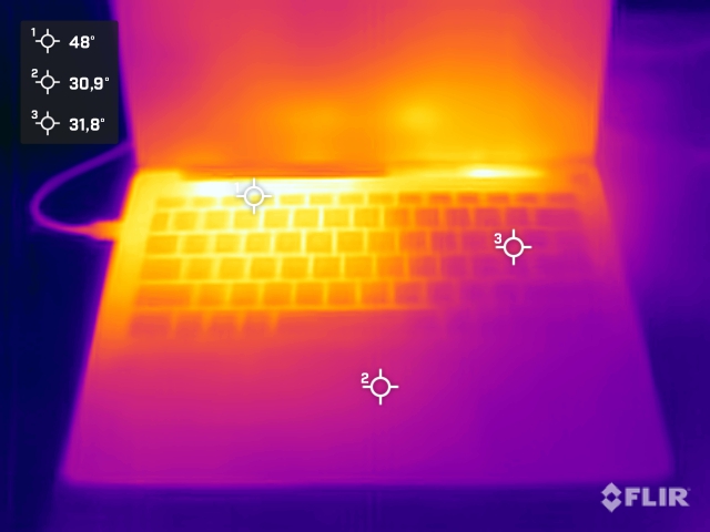(±) 3: The average temperature for the upper side is 34.9 °C / 95 F, compared to the average of 30.8 °C / 87 F for the class Subnotebook.