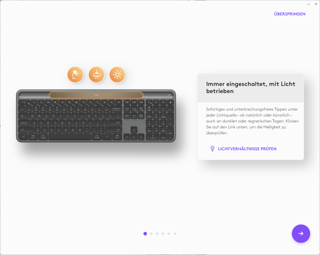 Paketin içinde klavyenin yanı sıra kısa bir kullanım kılavuzu da yer alıyor. Ambalaj minimalist ve Logitech'in sürdürülebilirlik taahhüdüne uygun olarak büyük ölçüde geri dönüştürülmüş malzemeden oluşuyor. Güneş enerjisi teknolojisi özellikle dikkat çekicidir: Klavye, hem doğal hem de yapay ışıkla (en az 200 lüks) şarj edilebilen entegre bir güneş piline sahip. Bu, harici bir güç kaynağının genellikle gereksiz olduğu ve çevresel etkiyi daha da azalttığı anlamına geliyor. Üreticiye göre, sadece bir saatlik güneş ışığı klavyeye birkaç hafta boyunca güç sağlamak için yeterli.