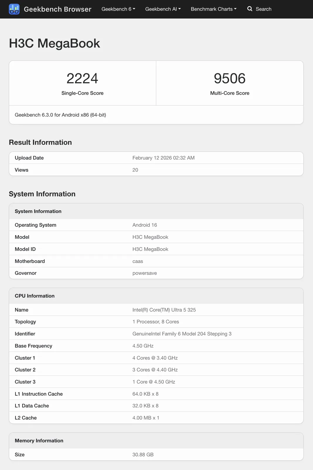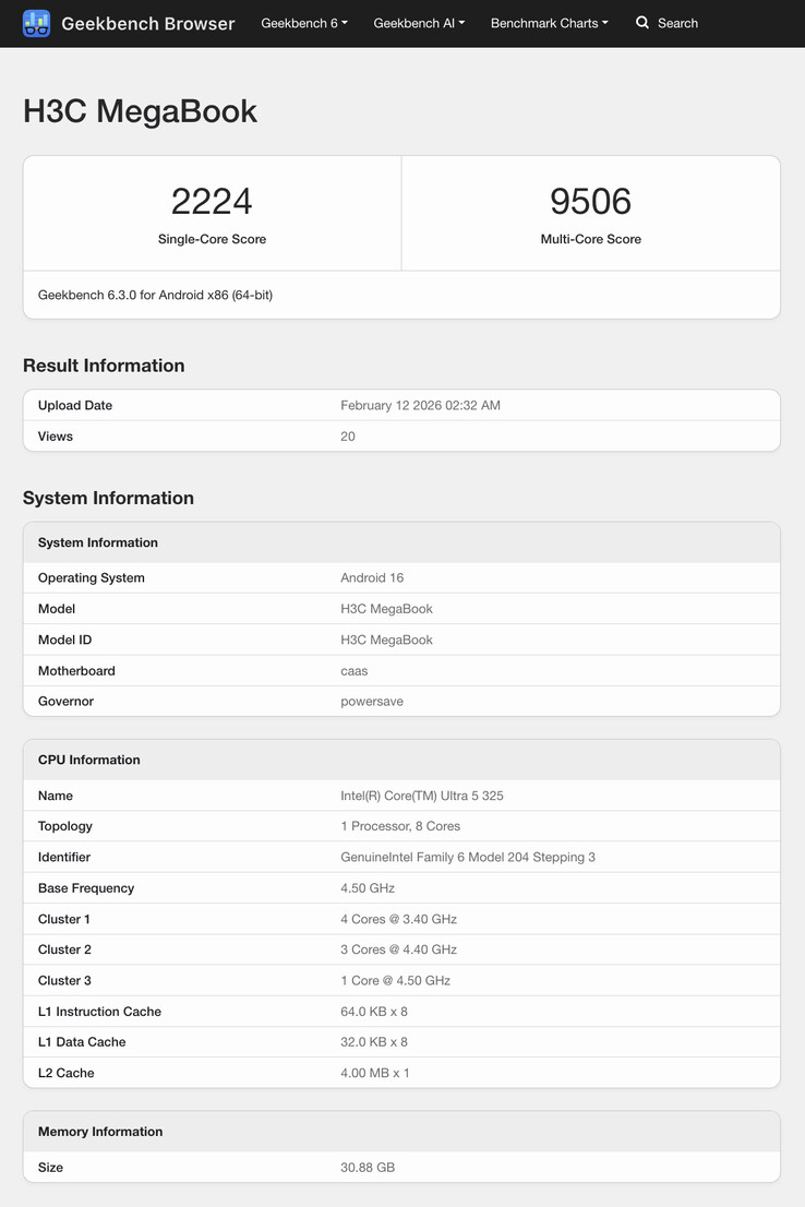 Şimdi, geçen yılki H3C MegaBook'un Panther Lake tabanlı bir halefi neredeyse elimizde gibi görünüyor. Resmi olarak, H3C'nin henüz MegaBook'un yeni bir versiyonuna atıfta bulunduğunu göremiyoruz. Bununla birlikte, Geekbench Intel'in MegaBook'larını içeren H3C MegaBook listeleriyle doludur Core Ultra 5 325 i̇şlemci. 32 GB'a kadar RAM ile eşleştirildiğinde Core Ultra 5 325 sırasıyla 4,5 GHz ve 3,4 GHz tepe saat hızlarına sahip 4 P çekirdeği ve 4 Düşük Güç çekirdeğine sahiptir.