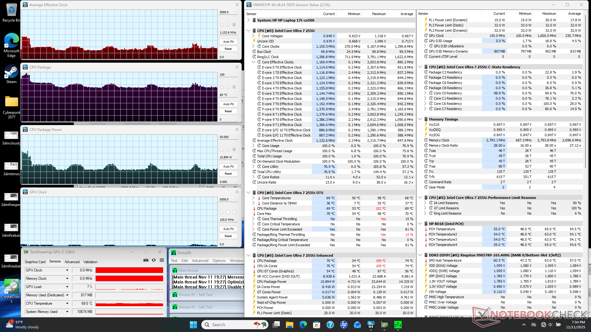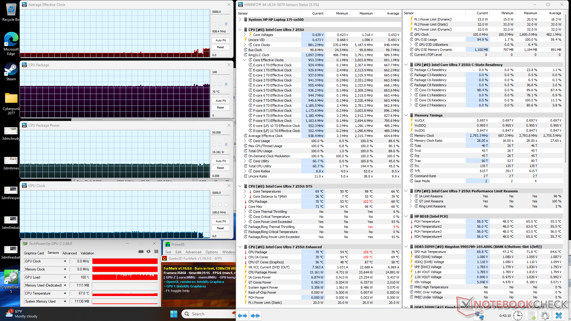 CPU, Prime95 stresini başlatırken birkaç saniyeliğine 2,3 GHz, 33 W ve 95 C'ye yükseliyor, ardından sıcaklıkları daha yönetilebilir seviyelerde tutmak için 0,9 GHz ila 1,3 GHz, 69 C ila 77 C ve 15 W ila 20 W aralığında dönüyordu. Stres altında döngü saat hızları, CineBench R15 xT skorlarının döngüselliği ile ilgili yukarıdaki gözlemlerimizi doğrulamaktadır.