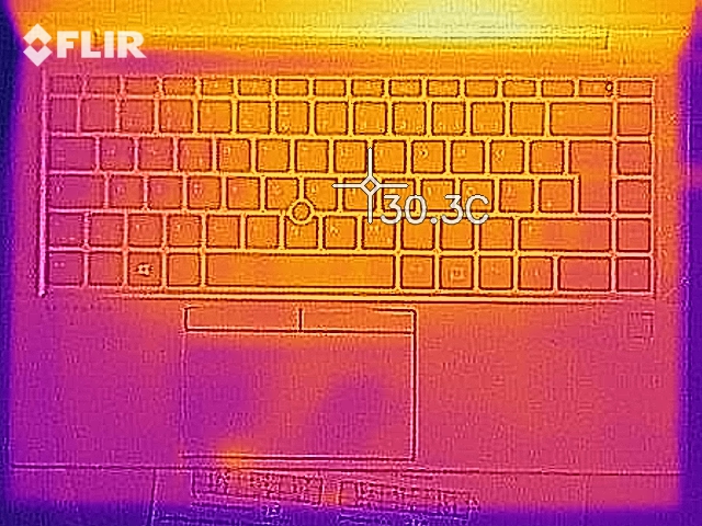 Despite the deactivated fans in idle usage, heat development only rises to about 30 °C (~86 °F), both at the top and bottom of the device. You can't really call this a hotspot. The temperatures rise significantly under load due to the stress test; it's no wonder that 100 °C (~212 °F) is measured at the SoC. We then see 51 to 57 °C (~124 to ~135 °F) here. At all times, the palm rest remains sufficiently cool or only gets moderately warm.