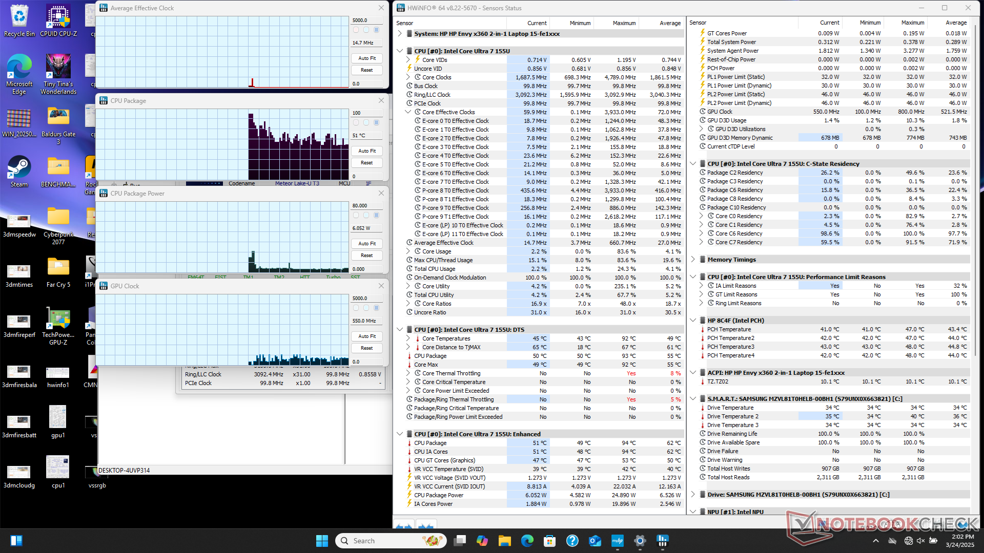 | HP Envy x360 15 fe1071cl Ultra 7 155U, Graphics 4-Core iGPU (Arrow Lake), Samsung PM9C1 MZVL81T0HELB-00BTW, IPS, 1920x1080, 15.6" | HP Envy x360 15-fe0072ng i7-1355U, Iris Xe G7 96EUs, Intel SSD 670p SSDPEKNU512GZ, OLED, 1920x1080, 15.6" | Lenovo IdeaPad Slim 5-15ARP G10 R7 7735HS, Radeon 680M, Western Digital PC SN5000S SDEPMSJ-512G, IPS, 1920x1200, 15.3" | LG Gram SuperSlim (2023) i7-1360P, Iris Xe G7 96EUs, SK hynix PC801 HFS001TEJ9X101N, OLED, 1920x1080, 15.6" | Dell Inspiron 15 Plus i5-11400H, GeForce RTX 3050 4GB Laptop GPU, Micron 2450 512GB MTFDKBA512TFK, IPS, 1920x1080, 15.6" | Asus VivoBook S15 K5504 i9-13900H, Iris Xe G7 96EUs, WD PC SN560 SDDPNQE-1T00, OLED, 2880x1620, 15.6" | |