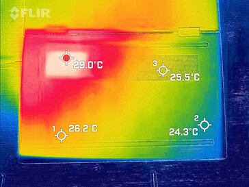 (±) Alt kısım, 36.8 °C / 98 F ortalamasına kıyasla maksimum 40.3 °C / 105 F'ye kadar ısınır