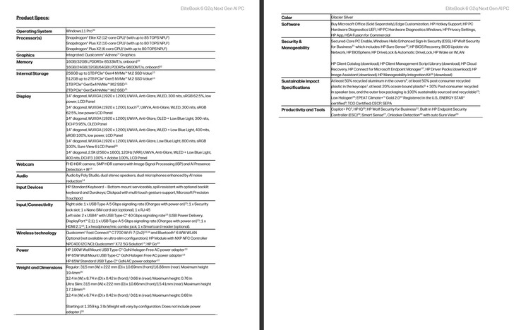 EliteBook 6 G2q'ya gelince, HP ayrıca hangi işlemciyi tercih ettiğinize bağlı olarak 32 GB'a kadar LPDDR5X-8533 veya 64 GB LPDDR5X-9600 RAM ile sunuyor. Aynı şekilde, yeni 14 inç dizüstü bilgisayar 1 TB'a kadar PCIe Gen 4 ve 2 TB'a kadar PCIe Gen 5 depolama ile yapılandırılabilecek. Bluetooth 6 ve Wi-Fi 7 bağlantısı Qualcomm'un Fast Connect C7700 modemi tarafından sağlanıyor. NXP NPC400 NFC denetleyicisi gibi bir X72 5G modem de mevcut.