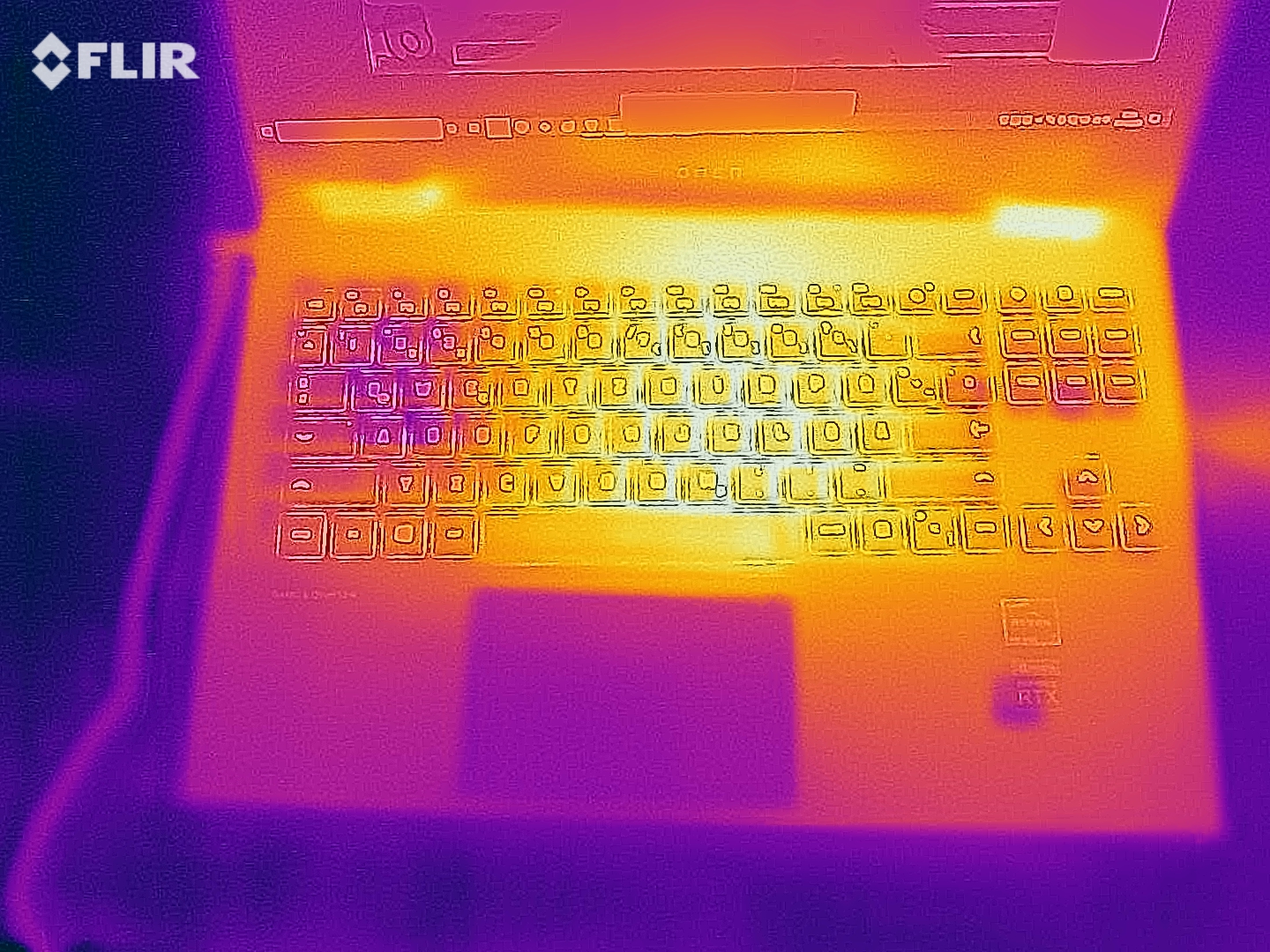 The temperature development of the chassis varies a lot. While the case's bottom heats up to over 50 °C (122 °F) in some places under full load, the top only reaches a maximum of 42 °C (107.6 °F) - a moderate rate. Under the hood, the processor in particular heats up. After 60 minutes of stress testing with the Furmark and Prime95 tools, the Ryzen 7 4800H made itself comfortable at around 86 °C (186.8 °F). The GeForce RTX 2060 stayed noticeably cooler with just under 70 °C (158 °F). The values in the Witcher 3 test can be seen in the first screenshot.