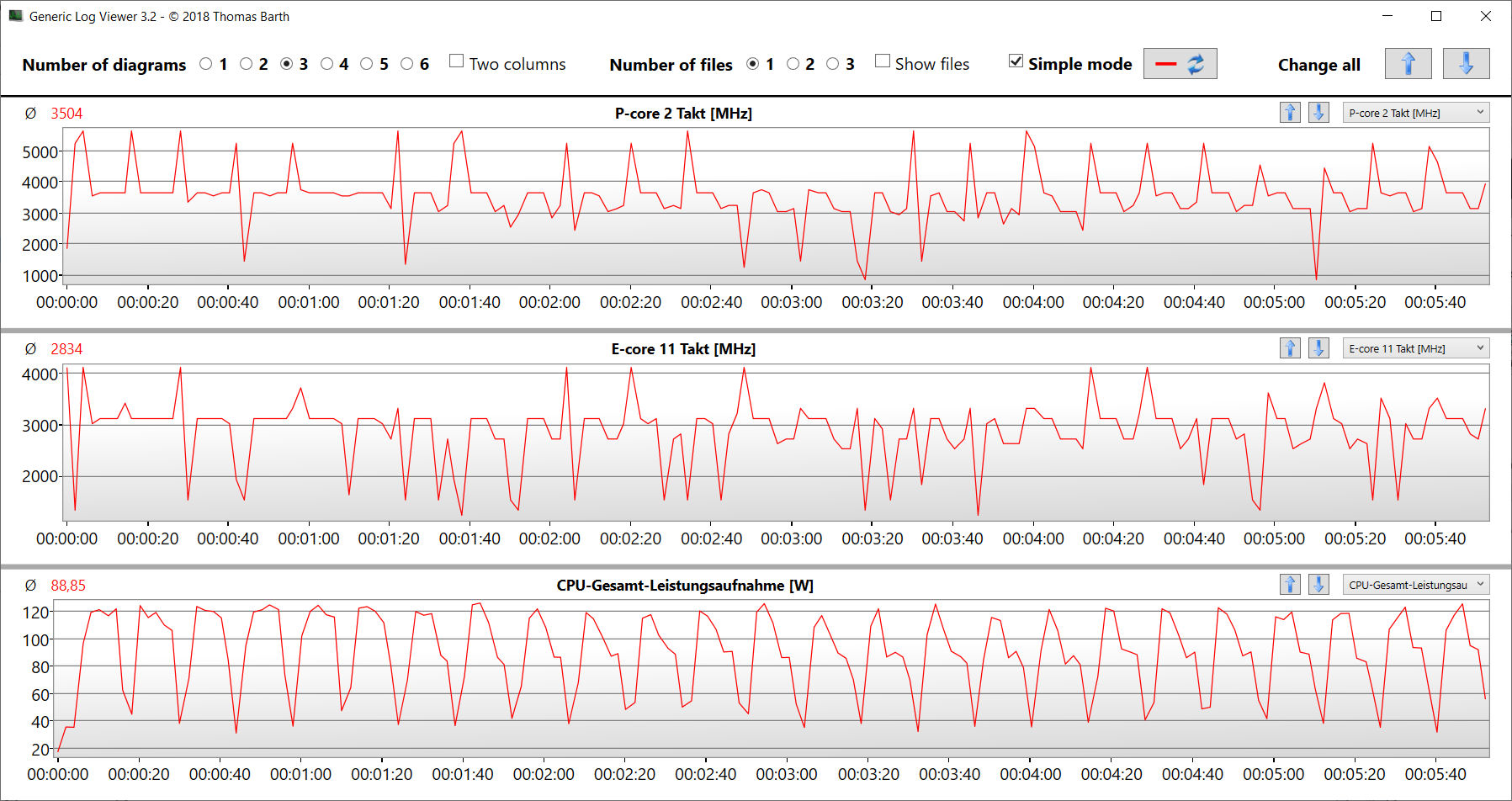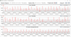 Sürekli çoklu iş parçacığı yükü (CB15 döngüsü) altında fark açılmıştır. Dördüncü çalıştırmanın başlangıcında, saat hızı testin geri kalanı için nispeten tutarlı bir seviyeye yerleşmeden önce önemli ölçüde düştü. Performans modunda, saat hızı başlangıç seviyesinde tutulmuştur. Pil gücünde, daha alakalı olan tek iş parçacığı puanı (206 puan; CB15), çok iş parçacığı puanından (1.596; CB15) daha küçük bir marjla azalmıştır.
