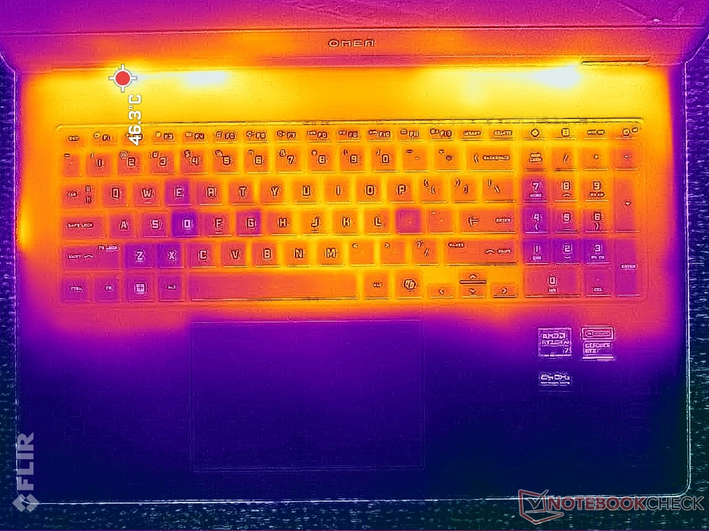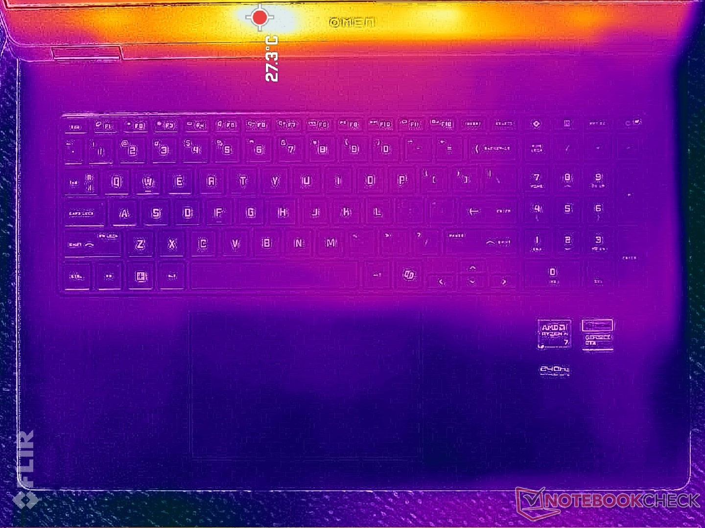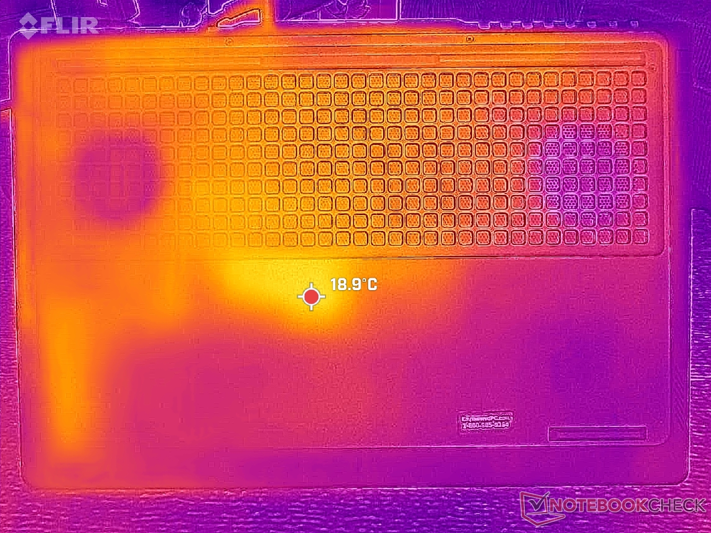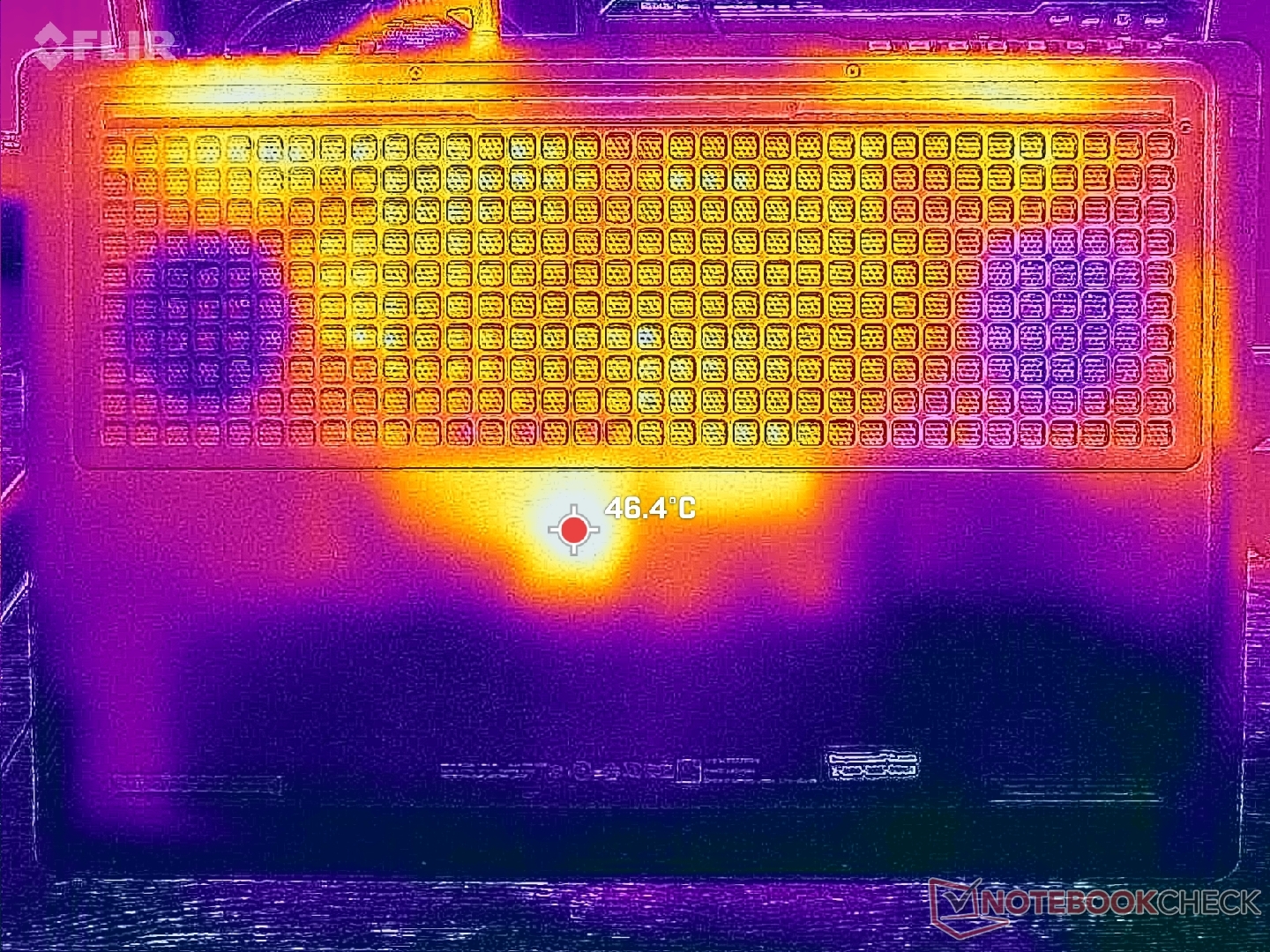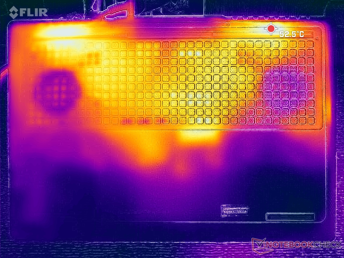 Yüzey sıcaklıkları, oyun oynarken sıcak noktaların neredeyse 40 C'ye ulaşabildiği klavye merkezine doğru en sıcaktır. Neyse ki WASD tuşları, numpad ve avuç içi dayanakları çok daha serin kalıyor.