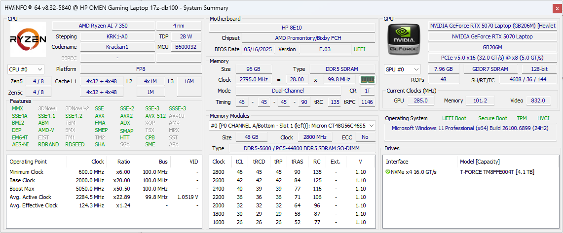 | HP Omen 17z-db100 AMD Ryzen AI 7 350 ⎘ NVIDIA GeForce RTX 5070 Laptop ⎘ 96 GB Bellek | Amazon: $1,989.00 Liste fiyatı: 1550 USD | 2.9 kg | 30.1 mm | 17.30" 2560x1440 170 PPI IPS | |