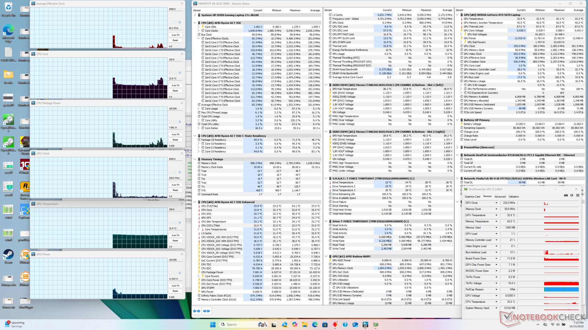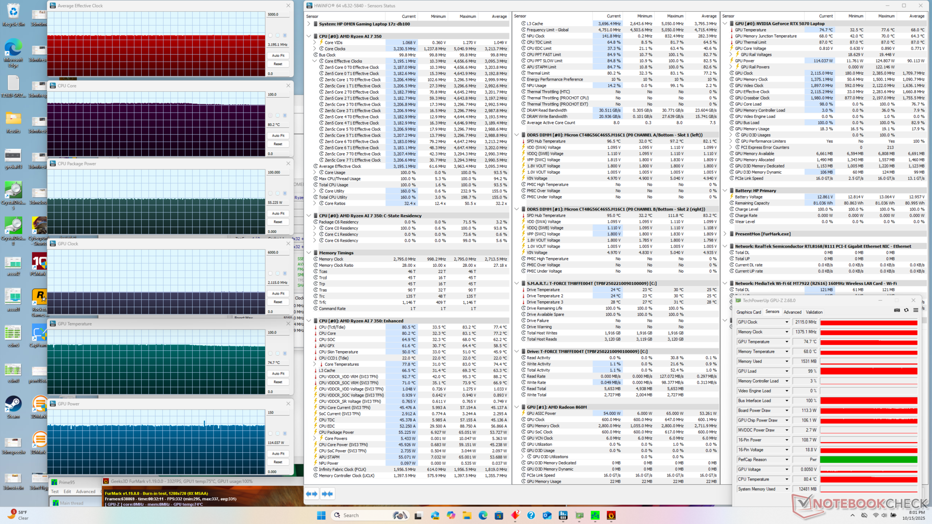 | HP Omen 17z-db100 Ryzen AI 7 350, GeForce RTX 5070 Laptop, 83 Wh | HP Omen 17-db0079ng R7 8845HS, GeForce RTX 4070 Laptop GPU, 83 Wh | Lenovo LOQ 17IRX10 i7-14700HX, GeForce RTX 5070 Laptop, 60 Wh | MSI Crosshair A17 HX D8WGKG R9 8940HX, GeForce RTX 5070 Laptop, 90 Wh | Asus TUF Gaming A17 FA707XI-NS94 R9 7940HS, GeForce RTX 4070 Laptop GPU, 90 Wh | Acer Nitro 5 AN517-55-5552 i5-12500H, GeForce RTX 4050 Laptop GPU, 90 Wh | |