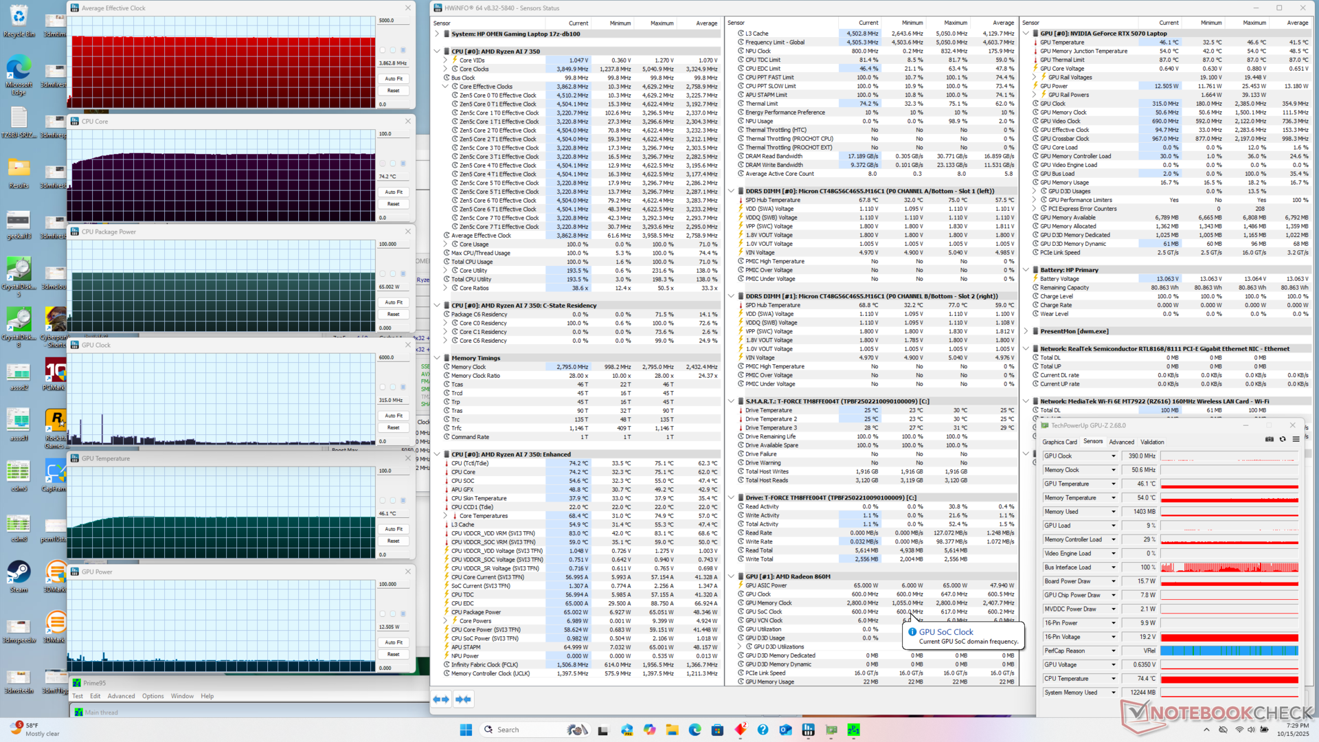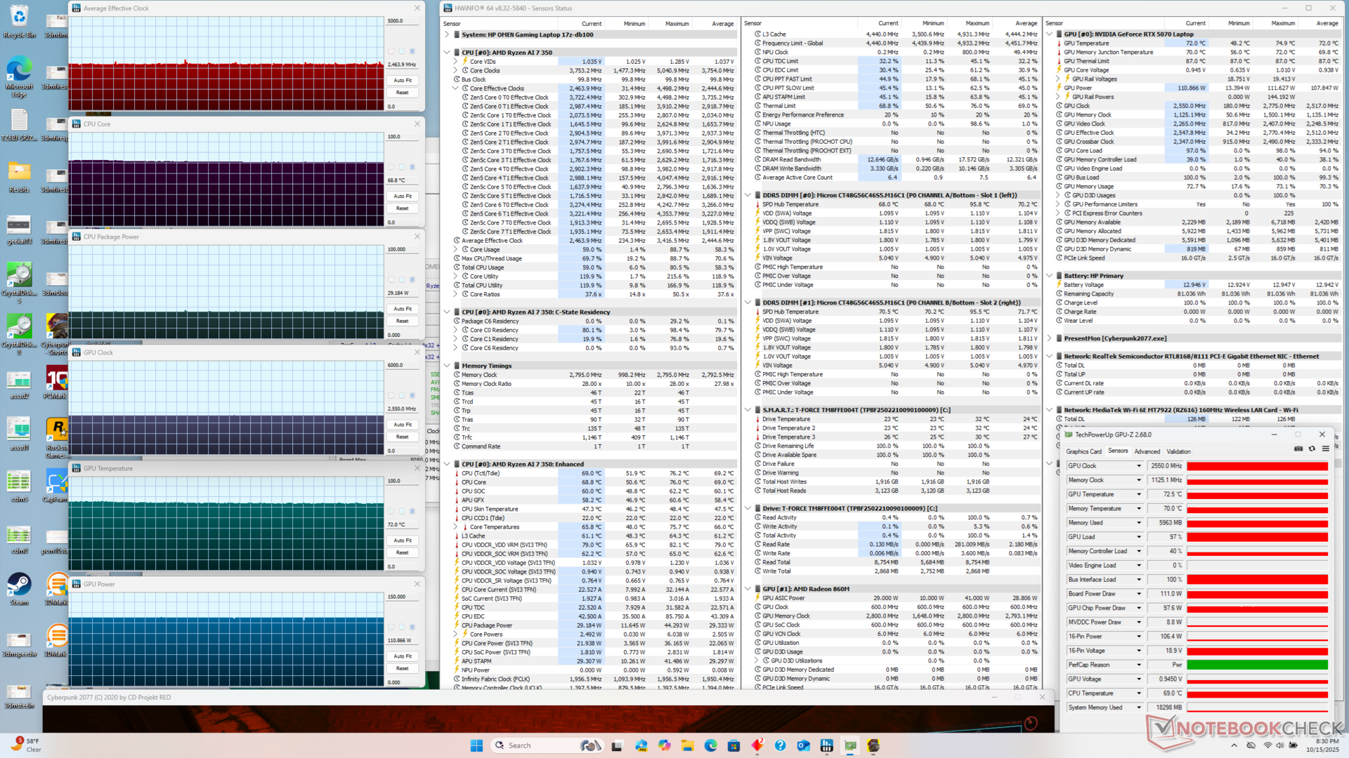 Yük altındayken ortalama tüketim seviyeleri, yeni modelimiz daha hızlı performans sunsa da genellikle geçen yılki modelde kaydettiğimizden daha düşük. Örneğin Cyberpunk 2077'yi çalıştırırken, 2025 Omen 17'miz yaklaşık yüzde 12 daha az güç talep ederken, watt başına daha iyi performans için yüzde 17 daha hızlı çalışıyor. GeForce RTX 40 serisi GPU'larda bu özellik mevcut olmadığından, çoklu kare oluşturma kullanıldığında kare hızı avantajları daha da büyük olabilir.