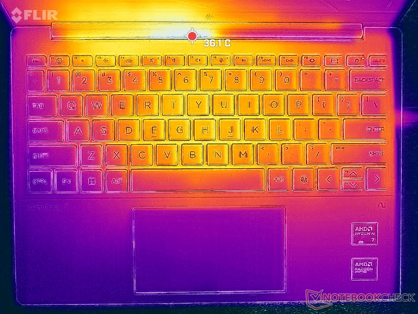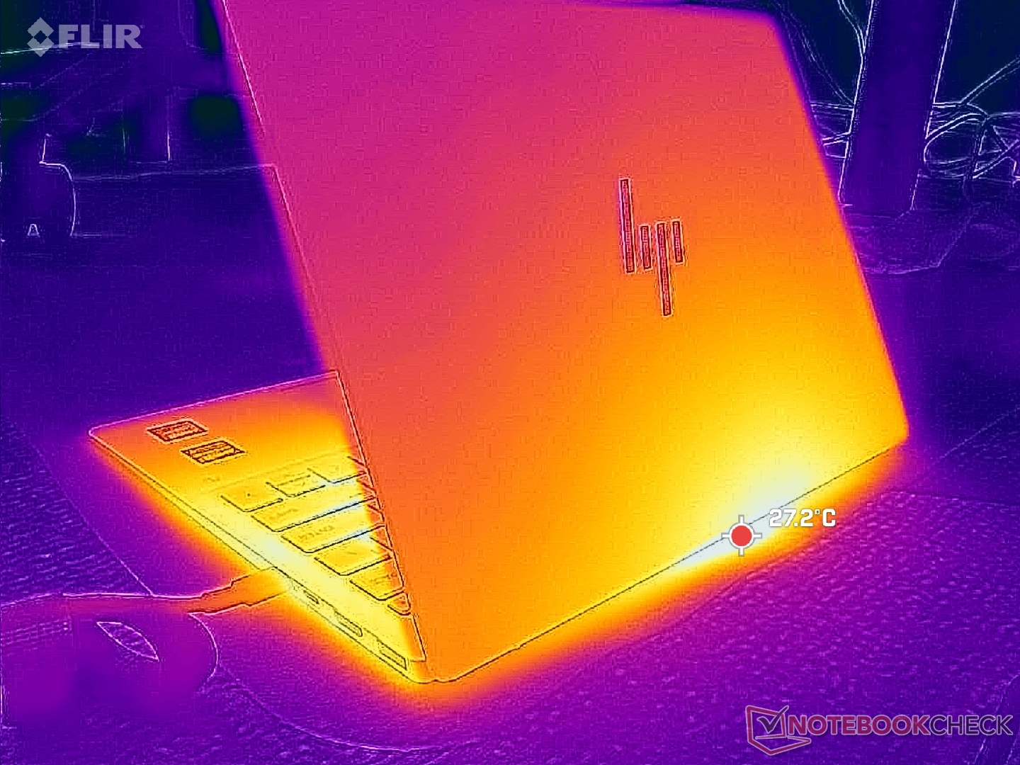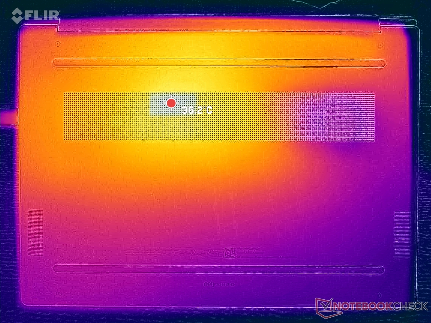 Yüzey sıcaklıkları asla rahatsız edici derecede sıcak değil, arka tarafa yakın sıcak noktalar zorlu yükleri çalıştırırken neredeyse 40 C'ye ulaşıyor. Bu, eski Dragonfly G4'te kaydettiğimize benzer ancak yine de G4'ten çok daha soğuk MSI Summit E13. AC adaptörü de benzer şekilde çok havalı kalacaktır.
