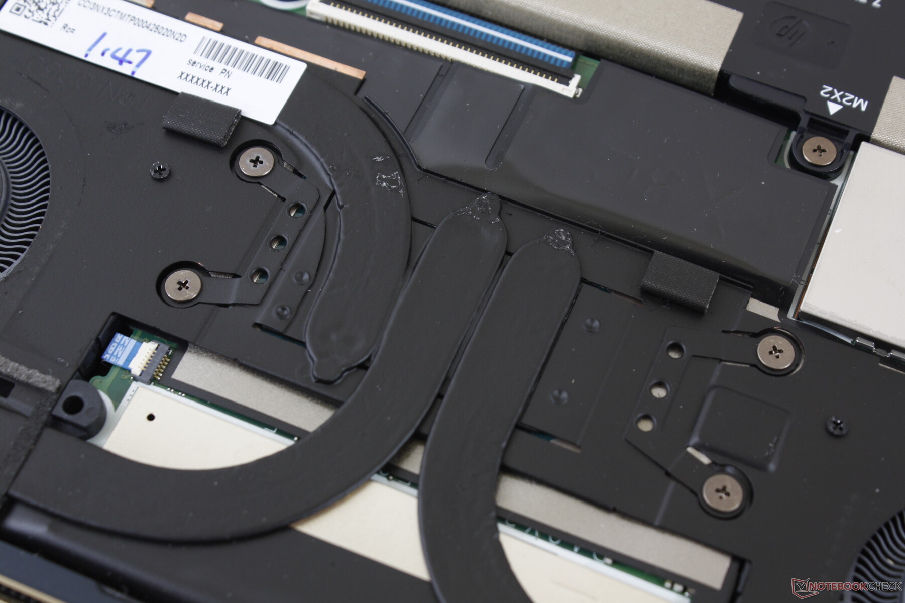 Surface temperature development is symmetrical due to the symmetrical cooling solution inside. The keyboard center can be as warm as 39 C while the bottom hot spot can be as high as 53 W when under high processing stress. These results are even warmer than what we recorded on the 13.3-inch Spectre x360 13 by 5 to 10 degrees C on each side. Though the palm rests are never too warm, a cooler bottom would have been appreciated.
