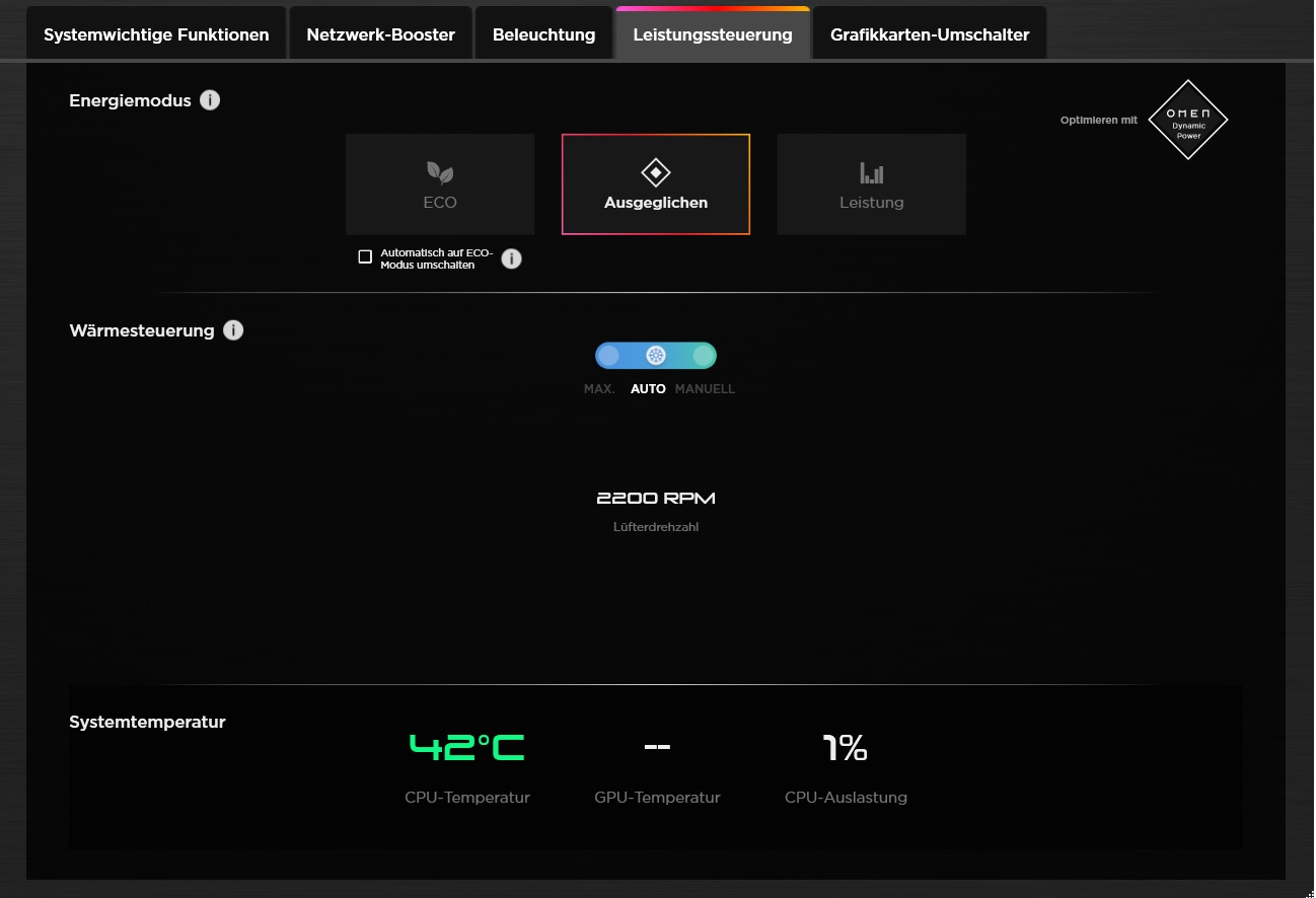 Önceden yüklenmiş Omen Gaming Hub'da kullanıcılar, diğer şeylerin yanı sıra, performans kontrolünü ayarlayabilirler (ekran görüntüsü #4). Performans modunda 3D performansı neredeyse hiç artmadığından, ancak gürültü önemli ölçüde arttığından, tüm ölçümleri Dengeli modda gerçekleştirdik. Eco modu adının hakkını kısmen veriyor: kare hızı ve gürültü seviyesi orta moda doğru yöneliyor.