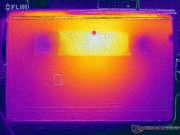 Yüzey sıcaklıkları merkeze doğru en sıcak ve klavyenin yanları veya kasanın kenarları boyunca daha soğuktur. Klavyenin ortasındaki ve altındaki sıcak noktalar 42 C'nin üzerine çıkabilir, bu da rakiplerine göre birkaç derece daha soğuktur ThinkPad P1 G6 aynı RTX 2000 GPU ile.