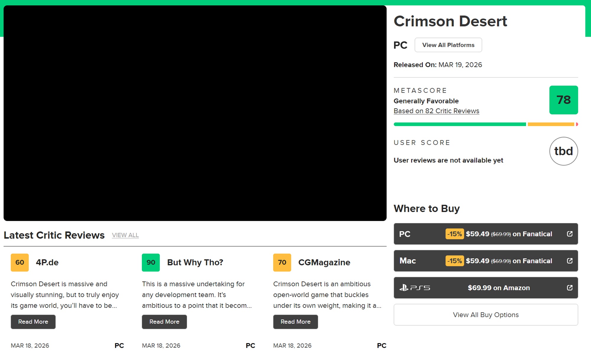 Her zaman satışları belirlemese de, eleştiriler yine de satın alma kararlarını etkileyebilir. Bu Crimson Desert inceleme ambargosu sonunda süresi doldu ve Metacritic'te düzinelerce değerlendirme yayınlandı. 82 başvurunun ardından, açık dünya oyunu 78 Metascore'a sahip. Çoğu site iddialı grafiklerini ve fiziğini övüyor, ancak birçok oyuncuyu hayal kırıklığına uğratabilecek sıkıntılara dikkat çekiyor.