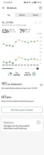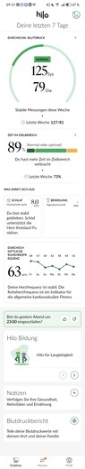 Deneyimler, Hilo Band'ın kan basıncını saatte iki ila üç kez ölçtüğünü ve ardından iki saatlik bloklar için ortalama bir değerin yanı sıra tüm ölçüm aralığını gösterdiğini göstermiştir. Tüm bireysel ölçümler de görüntülenebilir. Ölçümler doğrudan Optimal, Normal, Yüksek ve Çok Yüksek olarak kategorize edilir. Ek bir renk kodlama sistemi bunu çok net hale getirir. Fiziksel aktivite genellikle bu süre için hiçbir değer kaydedilmediği anlamına gelir.