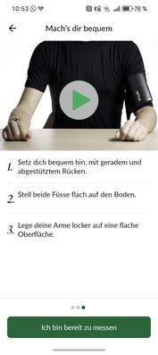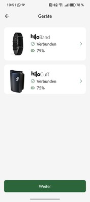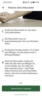 Birlikte verilen manşet (Bluetooth 4.2) bu amaç için kullanılır ve uygulama içinde kolayca eşleştirilebilir. Uygulama her iki cihazın da bağlı olduğunu algıladığında, adım adım yönlendirilen kalibrasyon işlemi başlatılabilir. İsteğe bağlı olarak, tek tek adımları tekrar açıklamak için videolar da oynatılabilir. Kalibrasyon, Hilo bandı zayıf ele ve manşet karşı tarafa takılarak arka arkaya üç ölçüm yapılarak gerçekleştirilir. Bu, incelemede herhangi bir sorun olmadan çalışıyor ve teknik olarak daha az eğilimli kişiler için bile kurulumu çok net ve gerçekleştirmesi kolay buluyoruz.