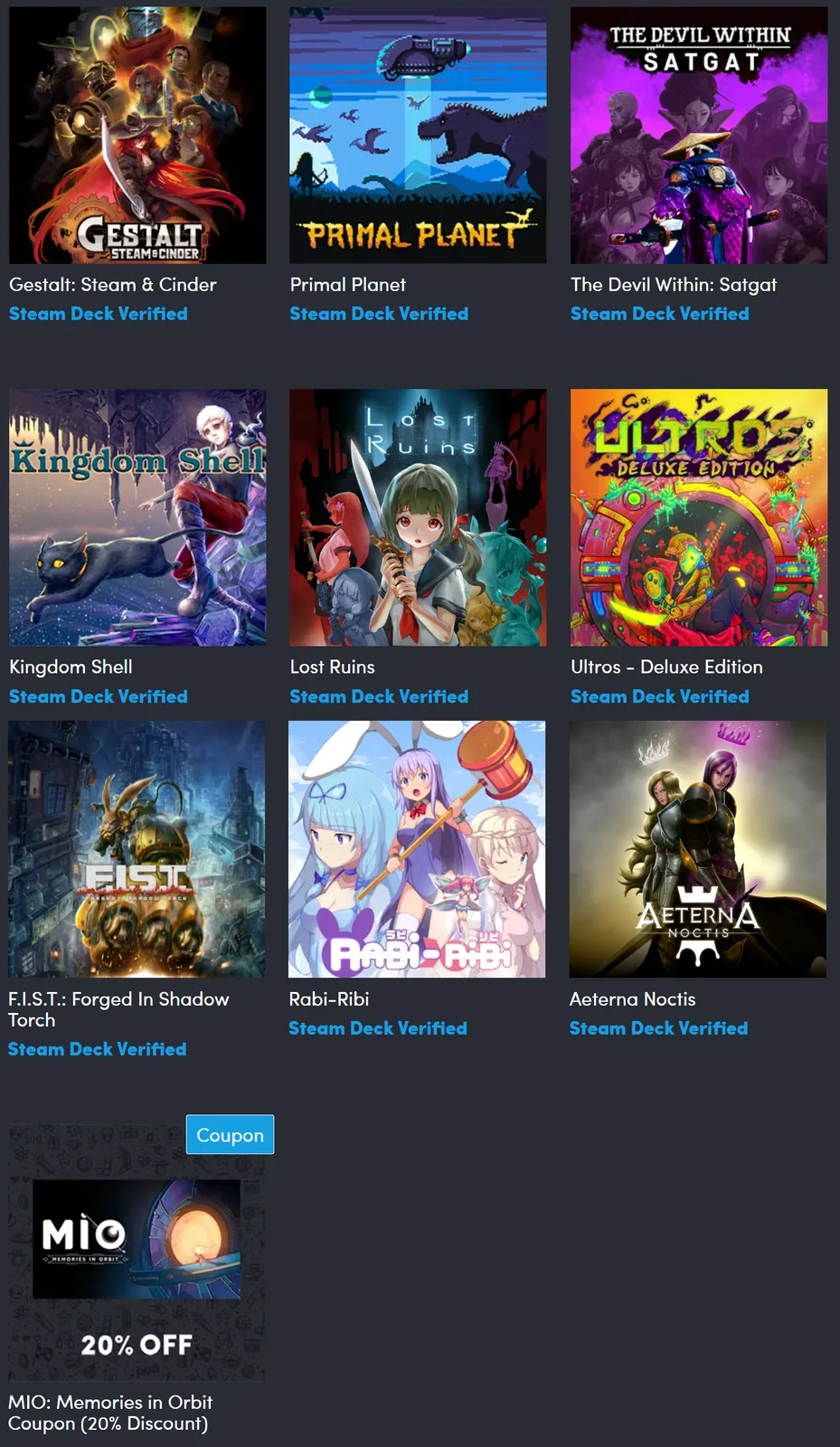 - Lost Ruins - hafızasınıkaybetmiş bir kız ve canavarlarla dolu harabeler etrafında şekillenen karanlık bir 2D hayatta kalma aksiyon oyunu. 2021'de piyasaya sürüldü, şu anda %85 olumlu değerlendirmeye sahip ve 19,99 dolara satılıyor (tüm zamanların en düşük fiyatı 6,99 dolar)