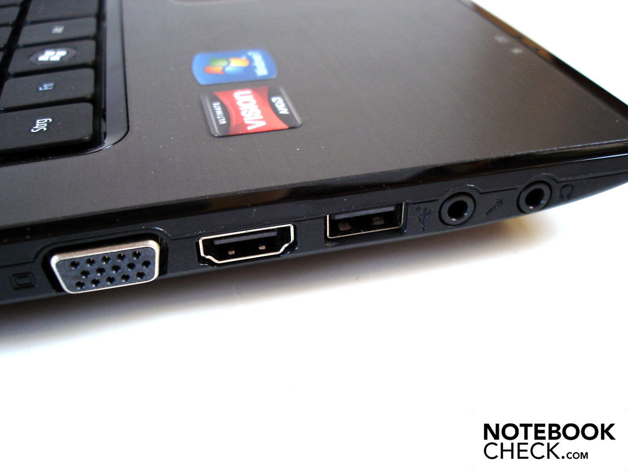 Acer bağlantı noktaları açısından oldukça muhafazakar davranmış. Kullanıcı ürünün üzerinde boşu boşuna ExpressCard yuvası aradığı gibi Firewire ya da eSATA yuvası da arayacaktır. Zaten geri kalan bağlantı noktaları da standart yuvalardan, yani her notebookta bulabileceğiniz cinsten. Bu durumda Aspire 7551G'nin üzerinde bulabileceğiniz yuvalar Kensington kilidi, RJ-45 gigabit LAN, 3 adet USB 2.0 yuvası(2 sağda 1 solda), ses girişi ve ses çıkışı oluyor. Harici monitörler VGA ya da HDMI ile bağlanabilir, ekran yuvası mevcut değil. Acer ayrıca ön tarafa SD, MMC, MS, MSPRO ve XD formatlarını destekleyen beşi bir arada kart okuyucu da yerleştirmiş.