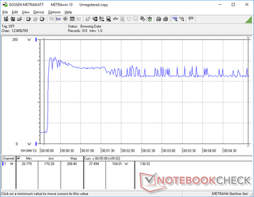 We're able to measure a maximum draw of 208 W from the medium-sized (~16.4 x 7.5 x 3.2 cm) 230 W AC adapter. This high of a consumption is unsustainable for more than half a minute as shown by our graphs below due to reaching thermal limits. It's possible to both recharge the system and run high loads like gaming simultaneously.