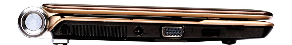 Küçük 10 inçlik netbook günlük kullanımda gerekli olabilecek en önemli bağlantı yuvalarına sahip. Mevcut tüm yuvalar cihazın yan taraflarına yerleştirilmiş. Sol tarafta Kensington kilidinin hemen yanında hava çıkışı, güç girişi, analog VGA-çıkışı, USB yuvası ve mekanik WLAN düğmesi yer alıyor. Sağ tarafta ise 2’si 1 yerde kart okuyucu (SD,MMC için), mikrofon ve kulaklık yuvaları, diğer iki USB yuvası ve LAN yuvası bulunuyor. Güç düğmesi de menteşelerin bulunduğu alana güzelce yerleştirilmiş.