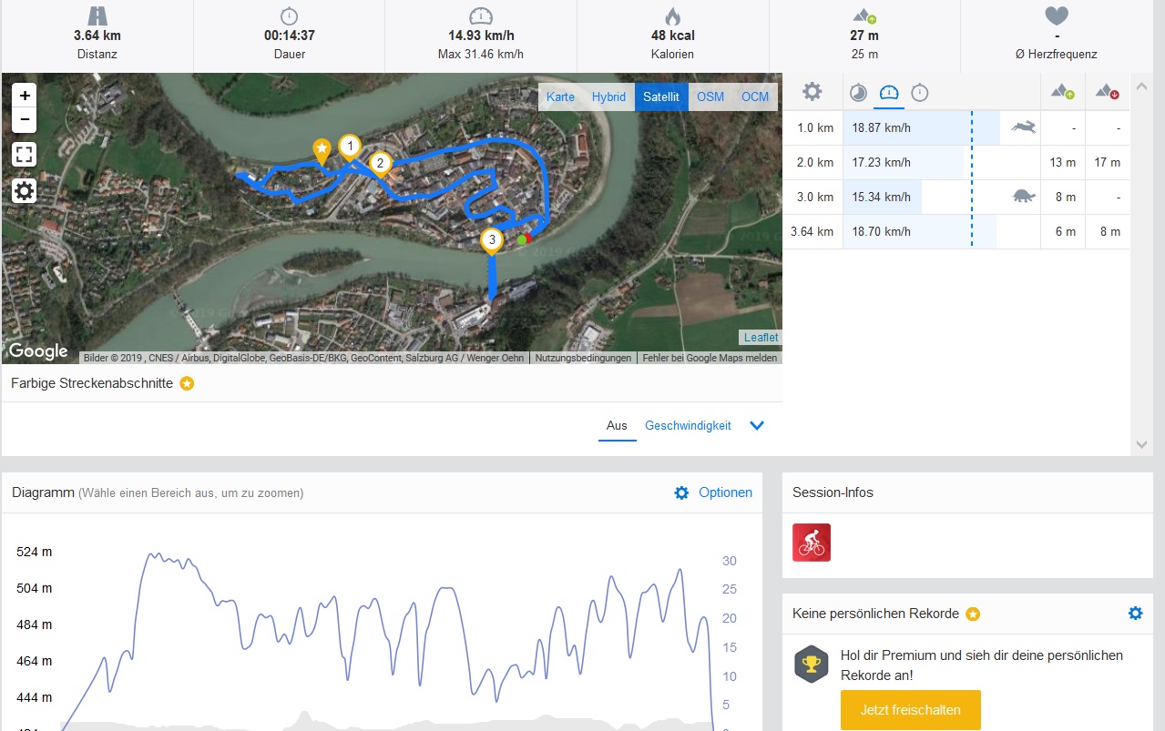Yerini belirleme açısından, GPS Test uygulamasına göre, Galaxy A40, yerini doğru bir şekilde belirleyebilmesi için içeride yeterli uydu sinyali alamıyor. Bu durum pencerenin yakınında bile iyileşmiyor. Dışarıda hızlıca uyduları bulabilse de, konumlandırma da orada başarılı olamıyor. Bu, birçok faktöre bağlı olabilir, ancak diğer akıllı telefonlarda, aynı anda ve yerde bir uydu alışı aldık. Ayrıca, bağlanabildiği WLAN ağlarını kullanarak kendisini yönlendiren Google Maps, konumumuzu hızla belirleyebilir ve Oldukça doğru, bu yüzden akıllı telefona yerleştirilmiş pusulanın iyi çalıştığını görebiliyoruz. Bir bisiklet turu ile akıllı telefonun pratikteki konumunu belirleme yeteneğini değerlendiriyoruz, ayrıca Garmin Edge 520 profesyonel navigasyon cihazı alıyoruz. A40 bazı eğrileri kesmeyi sever ve bazen bizi eski şehrin küçük sokaklarında yolun yanına yerleştirirken, profesyonel cihaz da burada mükemmel değildir. Bu nedenle, GPS Test uygulamasındaki arıza bir kusur olarak kalsa bile, Galaxy A40'ı kabul edilebilir konumlandırma yetenekleriyle varabiliriz.