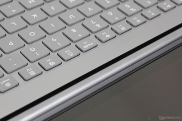 tuş düzeni ve simgeler, Yoga Pro 7 14 G9'daki iki seviyeli beyaz arka ışığa kadar aynıdır. Tuş geri bildirimi de aynı gibi görünüyor çünkü özellikle Boşluk tuşuna vurulduğunda takırtı hala nispeten yüksek. Bunun dışında yazma deneyimi tatmin edici ve Yoga Pro 7 14 G9'dan daha iyi XPS 15 daha yüksek ve daha sert tuşları tercih ediyorsanız.