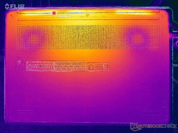 Yüzey sıcaklığı gelişimi, kasanın orta arka kısmına doğru sıcak noktalar ile simetriktir. Bu alanlar oyun oynarken 41 C'ye veya CPU uzun süre tam kullanımda kaldığında 46 C'nin üzerine çıkabiliyor. Sonuçlar, Snapdragon destekli Asus VivoBook S 15'ten önemli ölçüde farklı değilken, ortalama olarak daha küçük ve daha güçlü olan XPS 14.