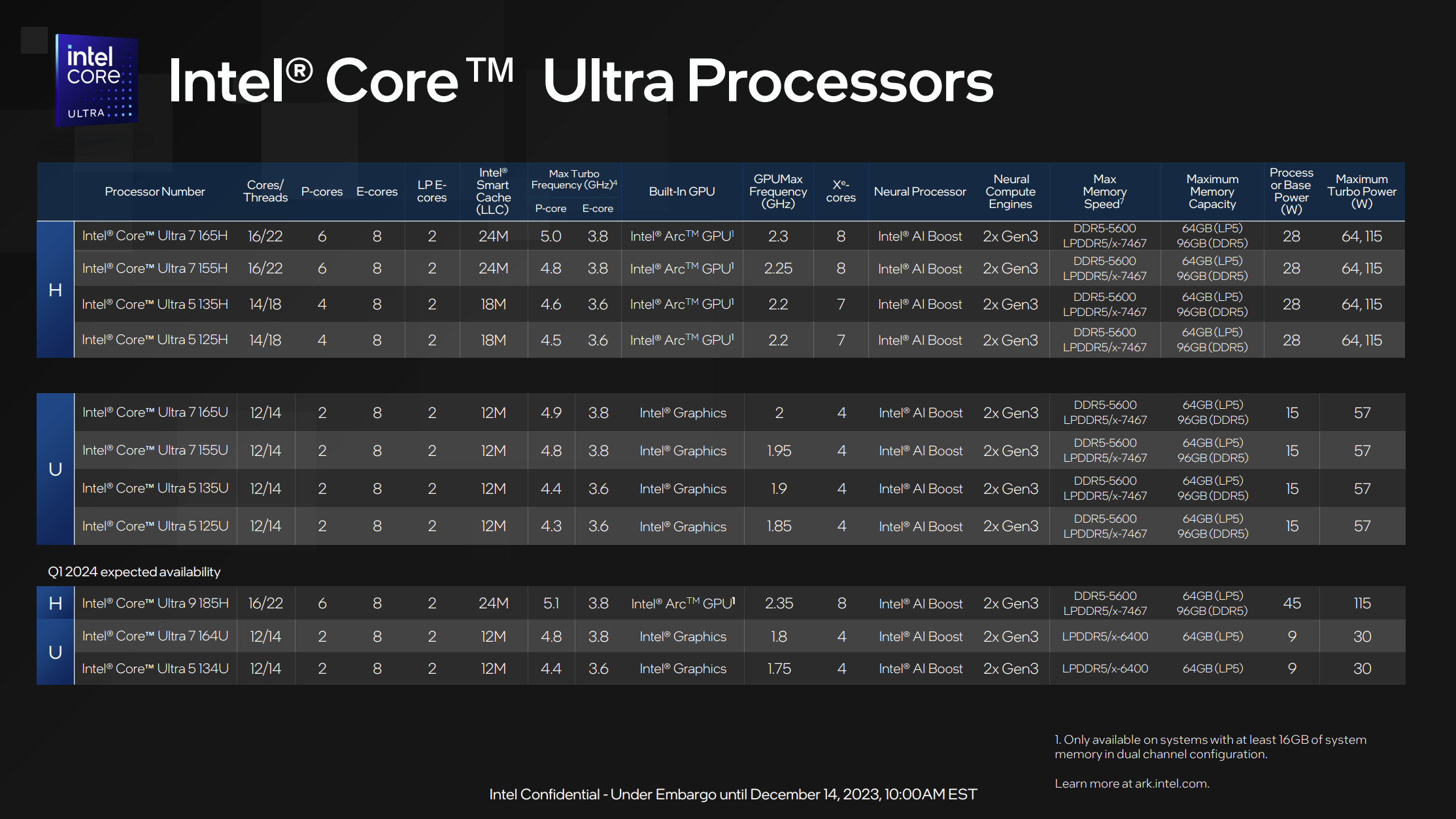 Normal U serisi yongaların yanı sıra H serisi modeller 64 GB'a kadar LPDDR5/x-7467-RAM veya 96 GB'a kadar DDR5-5600 RAM ile donatılabilir. 2024'te 9-30 Watt arasında daha düşük bir TDP aralığına sahip iki U serisi yonga daha olacak ve bunlar da daha yavaş LPDDR5x-6400 RAM ile donatılacak. Tüm yeni Core Ultra mobil işlemciler ayrıca iki Gen3 Nöral Hesaplama Motoruna sahip özel bir NPU (nöral İşlemci) ile donatılmıştır.
