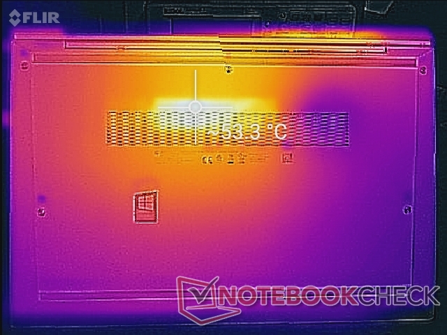 Yüzey sıcaklıkları genellikle 6 çekirdekli EliteBook 845 G7'ye göre daha sıcaktır. Aşırı yüklerle çalışırken sıcak noktalar, 6 çekirdekli yapılandırmada sadece 39 C'ye kıyasla, kasanın üst ve alt yüzeylerinde sırasıyla 44 C ve 53 C'ye ulaşır. Avuç içi dayanır ve klavye tuşlarının çoğu daha soğuk kalır ve bu nedenle yüksek sıcaklıklar rahatsız edici değildir.