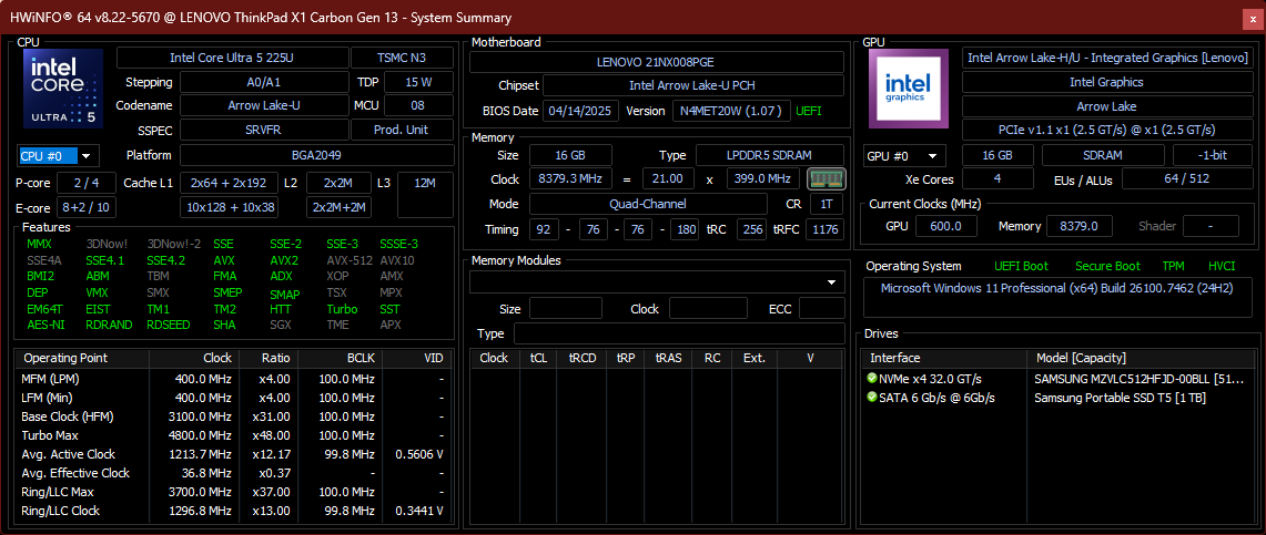 | Lenovo ThinkPad X1 Carbon Gen 13 21NX008PGE Ultra 5 225U, Graphics 4-Core iGPU (Arrow Lake) | Lenovo ThinkPad X1 Carbon Gen 13 21NS0010GE Core Ultra 7 258V, Arc 140V | Acer TravelMate P6 TMP614-54-TCO-553Z Core Ultra 5 226V, Arc 130V | HP EliteBook X G1i 14 AI Core Ultra 7 268V, Arc 140V | Dell Pro 14 Premium Core Ultra 7 268V, Arc 140V | Lenovo ThinkPad X9-14 Gen 1 Aura Edition Core Ultra 7 258V, Arc 140V | |