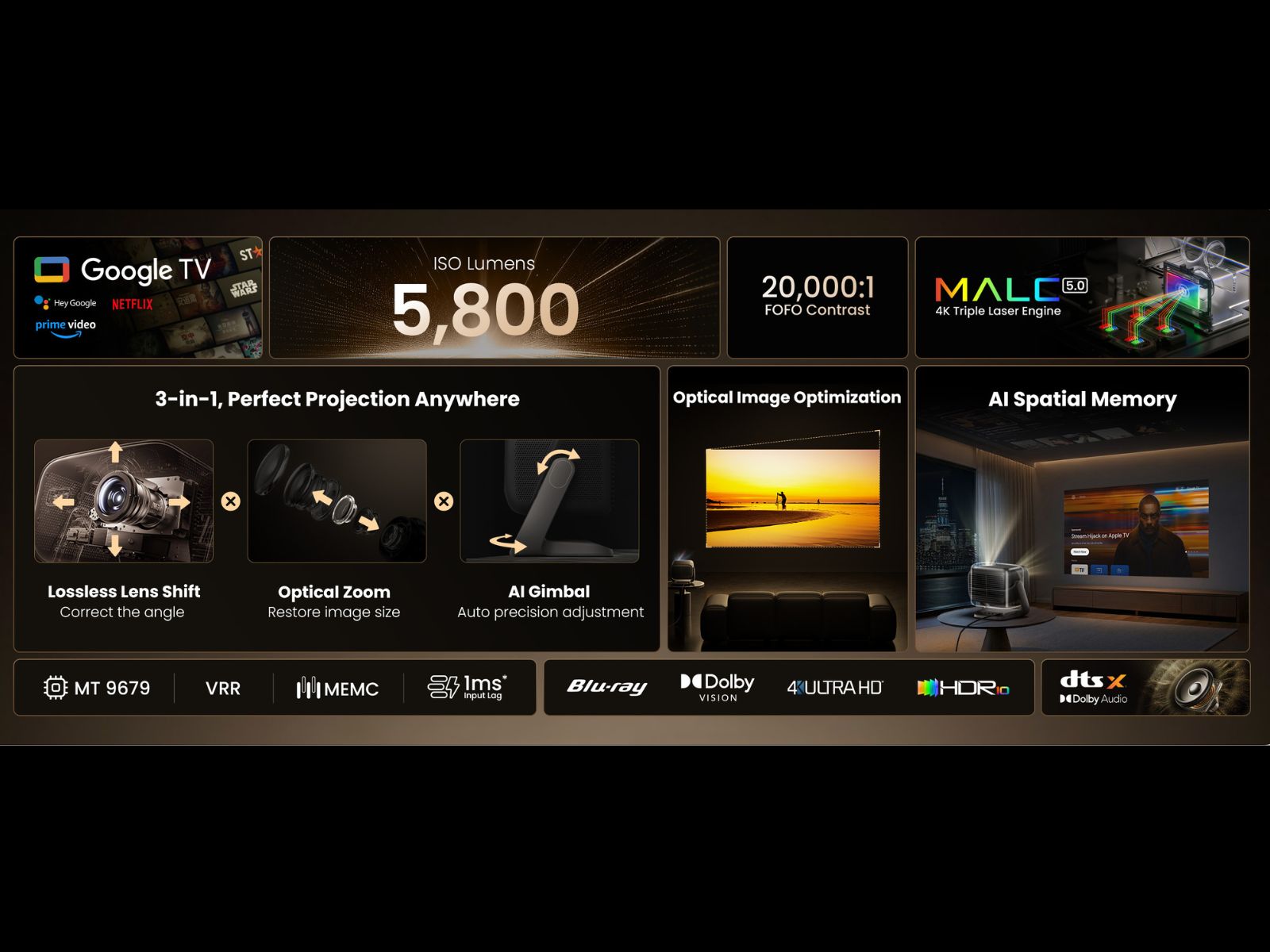 Ek akıllı özellikler arasında, tümü gerçek zamanlı yapay zeka ayarlamalarıyla gerçekleştirilen otomatik ekran uydurma, otomatik odaklama, engellerden kaçınma, duvar rengi adaptasyonu ve göz koruma mekanizmaları yer alıyor. Projektör Google tabanlı bir sistemle çalışıyor ve 4GB RAM ile 64GB dahili depolama alanı içeriyor.