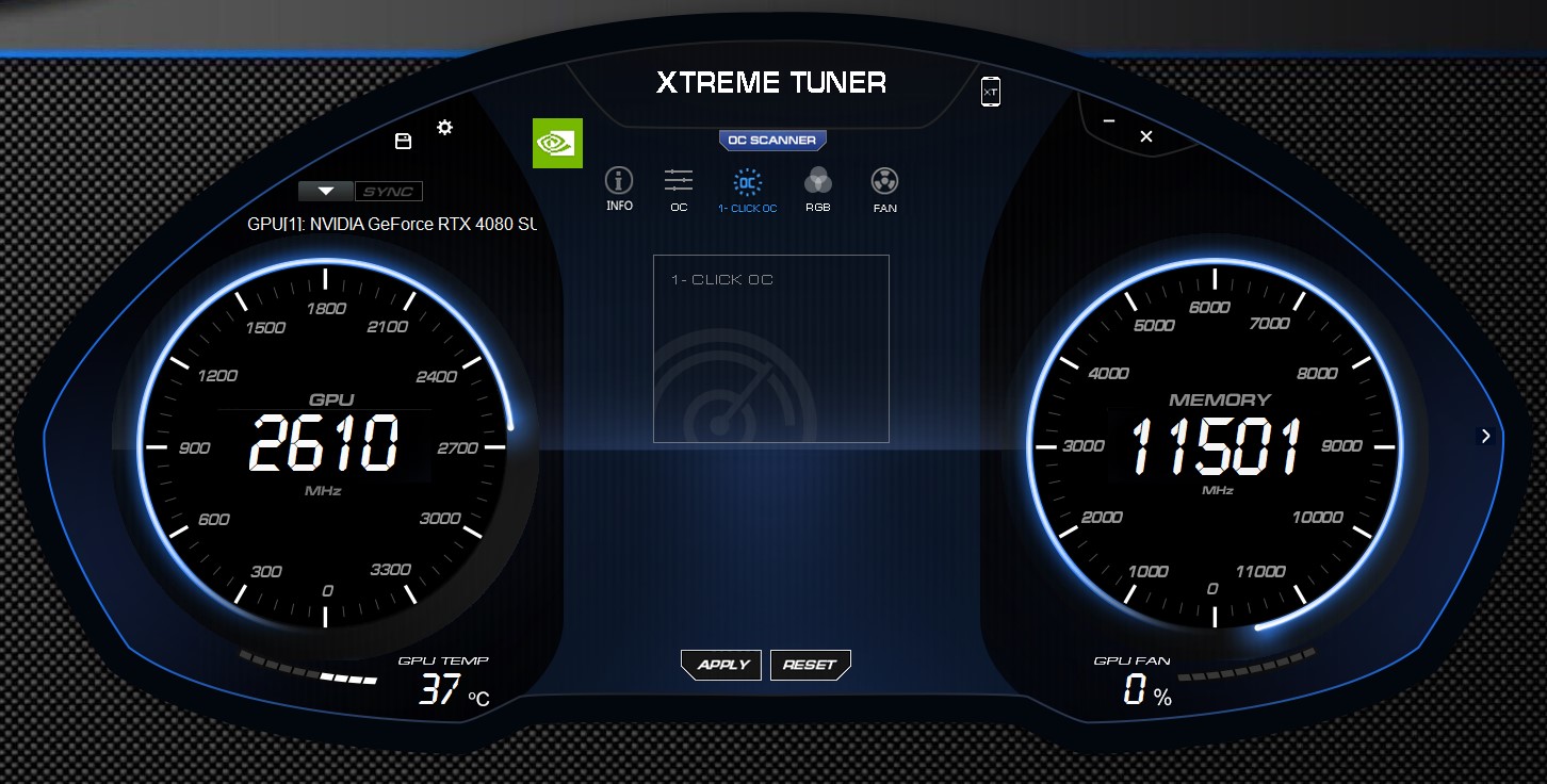 GeForce RTX 4080 Super SG için KFA2, Nividia tarafından belirtilen temel saati korudu, ancak artırma saati biraz artırılarak 2.610 MHz'e yükseltildi. Kart, testlerimizde sürekli olarak bundan çok daha yükseğe çıkabildi ve oyun testlerimiz sırasında her zaman 2.800 MHz işaretine yakın kaldı. KFA2 GeForce RTX 4080 Super SG de Xtreme Tuner Plus aracı kullanılarak kontrol edilebiliyor ve bu da 1-Click OC özelliği sayesinde biraz daha yüksek temel ve artırma saatlerine izin veriyor. Bununla birlikte, grafik kartı yük altında zaten 1-Click OC etkinken elde edeceğiniz 2.625 MHz'den çok daha hızlı çalıştığı için 15 MHz daha fazla kullanışlı olmaktan başka bir şey değildir.