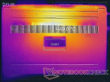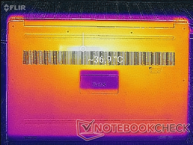 Surface temperatures are nothing new and not unlike last year's XPS 15 9570 since the underlying cooling solution and power envelope have not changed significantly. Temperature development remains nearly symmetrical with the hot spot towards the center of the keyboard. When gaming, this spot can become as warm as 56 C as shown by our temperature maps below. The carbon fiber palm rests will always be warm to the touch as well albeit nowhere near as warm as the keyboard keys. The WASD keys in particular can be as warm as 37 C when under high processing loads. If you've ever tried gaming on any XPS 15 SKU with GeForce graphics, then all these observations should sound familiar.