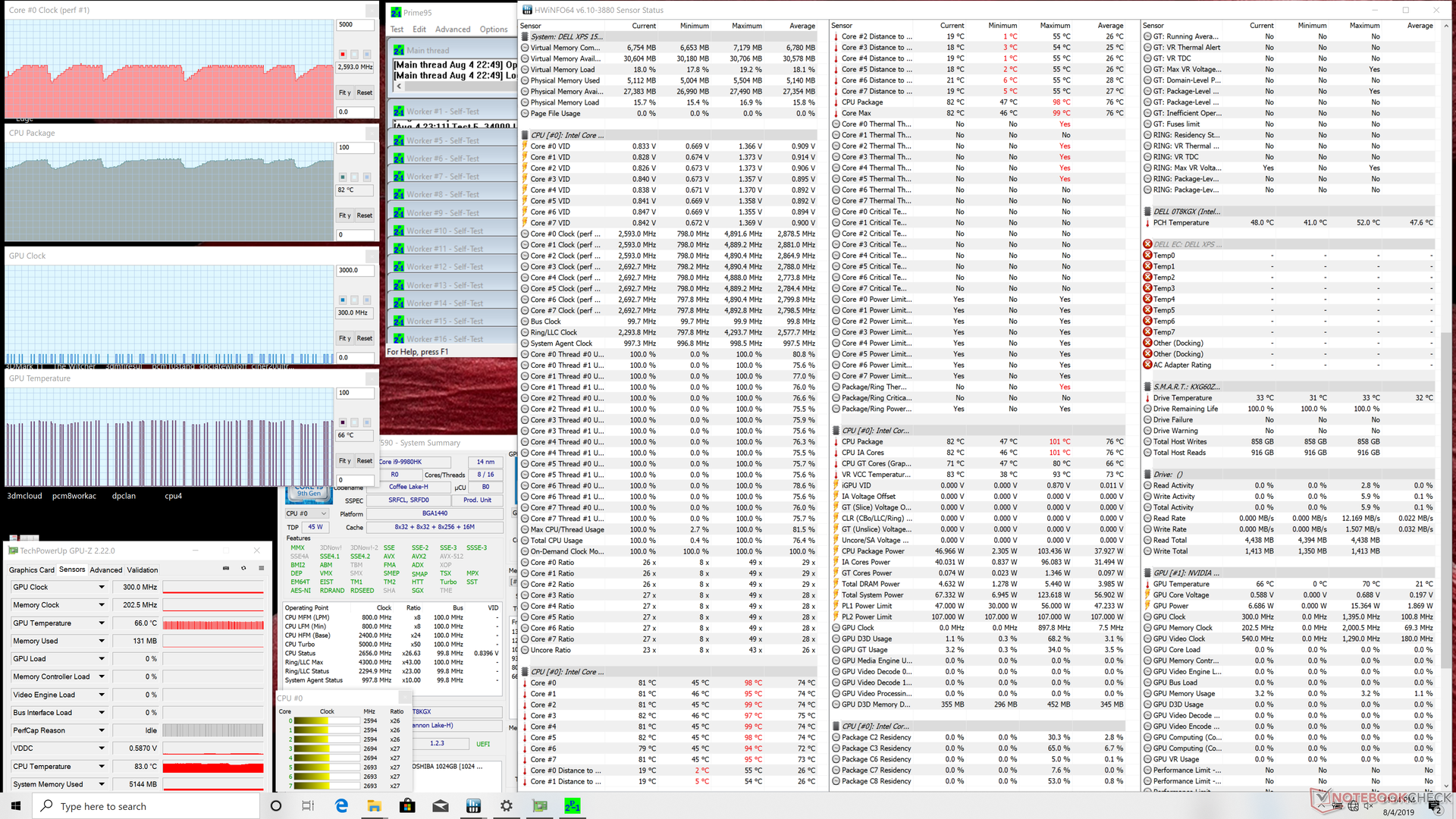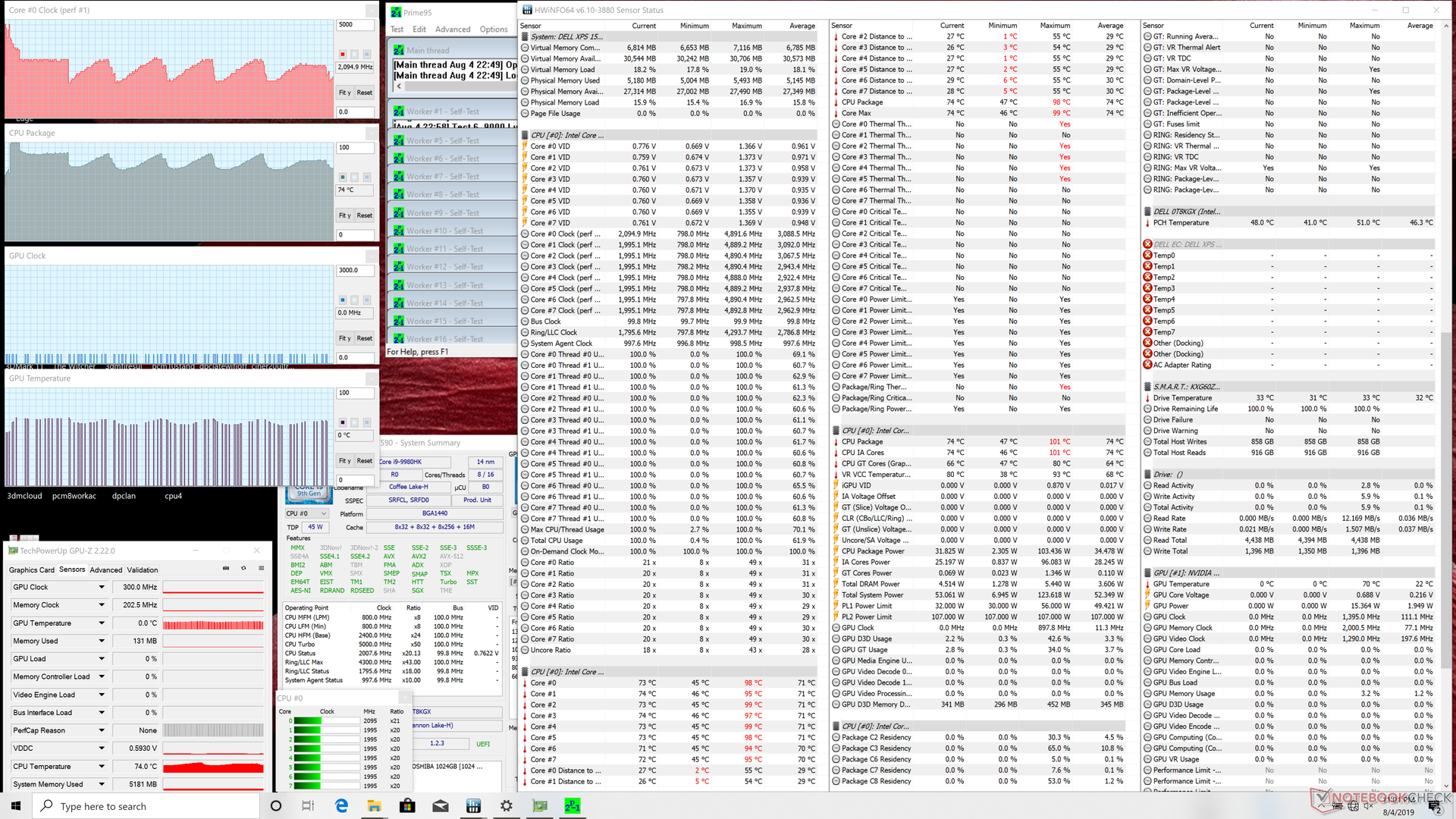 Since the base clock rate of the Core i9-9980HK is 2.4 GHz, the CPU will occasionally throttle down to as low 1.9 GHz with weak Turbo Boost of only +300 MHz. Most other Core H-series laptops will typically maintain a fixed clock rate and temperature when subjected to the same Prime95 conditions and so this is likely Dell's way of squeezing out more performance from the processor when it is fully stressed. Nonetheless, there's no question that the Core i9-9980HK is capable of so much more and that the XPS 15 is holding back its full performance potential.