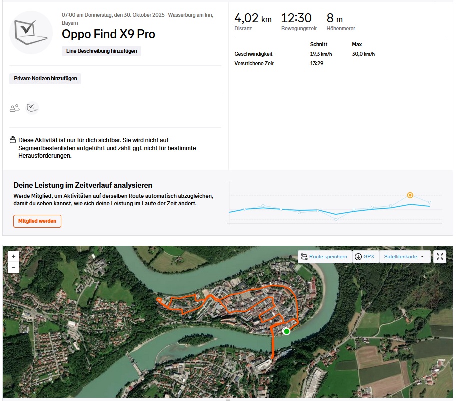 Günlük yaşamda konumlandırma doğruluğunu test etmek için Find X9 Pro'yu kısa bir bisiklet sürüşüne çıkardık ve ölçülen değerleri referans olarak bir Garmin Venu 2 ile karşılaştırdık. En iyi ihtimalle, Oppo telefonun konumu çift bantlı GNSS ve hızlı bir Satfix kullanılarak belirlenir - binaların içinde bile.