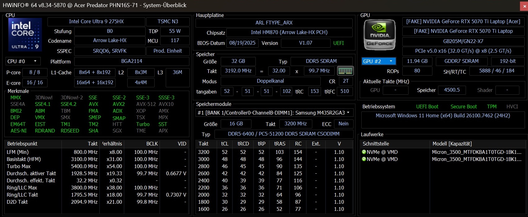 Core Ultra 9 275HX, RTX 5070 Ti dizüstü bilgisayar ve 32 GB RAM'e sahip Acer Predator Helios Neo 16S AI, çeşitli çevrimiçi mağazalardan (örneğin galaxus.de) yaklaşık 2.400 Euro'dan (yaklaşık 2700 ABD Doları) temin edilebilir.