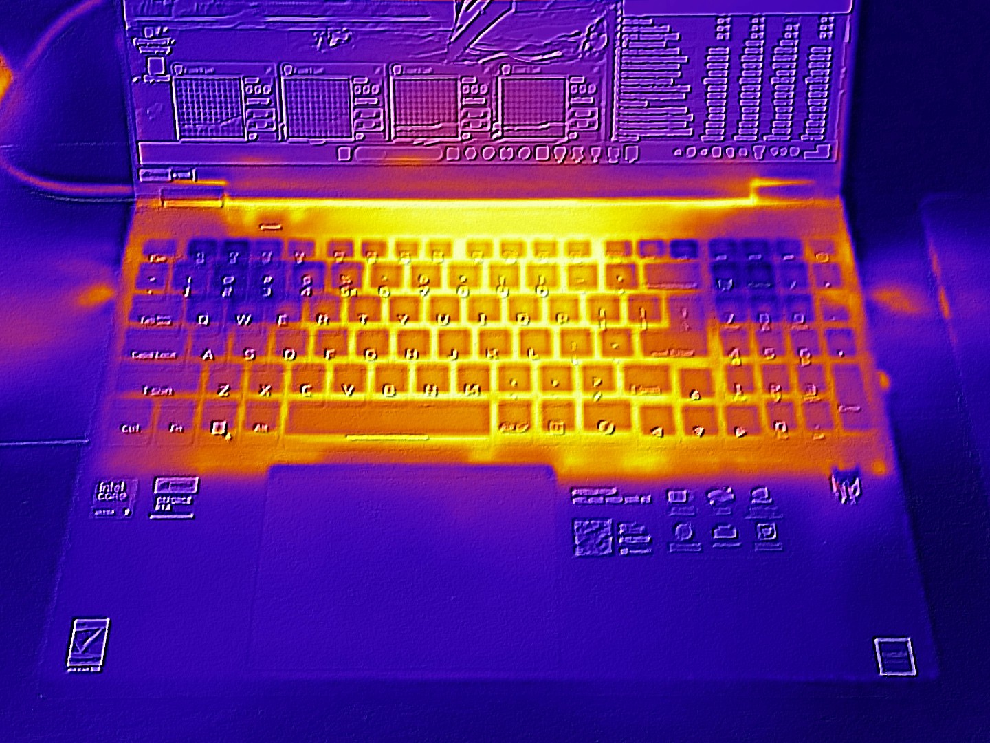 Sıcaklık gelişimi ile ilgili sonuç da benzerdir. Dizüstü bilgisayar rölantide çalıştığı sürece yüzeyler oldukça serin kalıyor ve 30 °C'nin altında kalıyor. 3D modunda, özellikle kasanın alt kısmı çok daha yüksek sıcaklıklara ulaşıyor: maksimum 55 °C, kucakta oyun oturumlarına karşı çıkıyor. Üst kısımdaki sıcaklık ise maksimum 47 °C ile daha ılımlı.