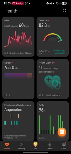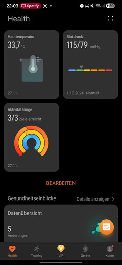 Sağlık uygulaması beş bölüme ayrılmıştır: Sağlık, Eğitim, VIP, Cihazlar ve Hesap. Sağlık sekmesi, kaydedilen tüm biyometrik veriler için özelleştirilebilir kutucuklar olarak görüntülenen bir gösterge paneli görevi görüyor.