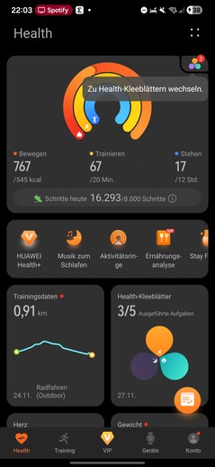 Tamamlanan egzersizler Antrenman altında görünür. VIP, ücretli Plus katmanına erişimin kilidini açar. Cihazlar sekmesinde ayarlar, AppGallery, müzik yönetimi ve çok çeşitli saat yüzleri bulunur.