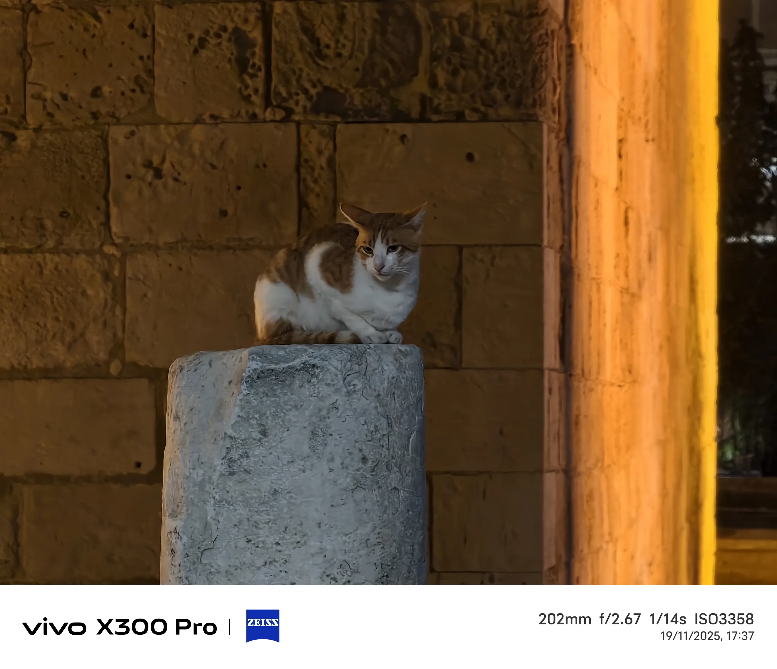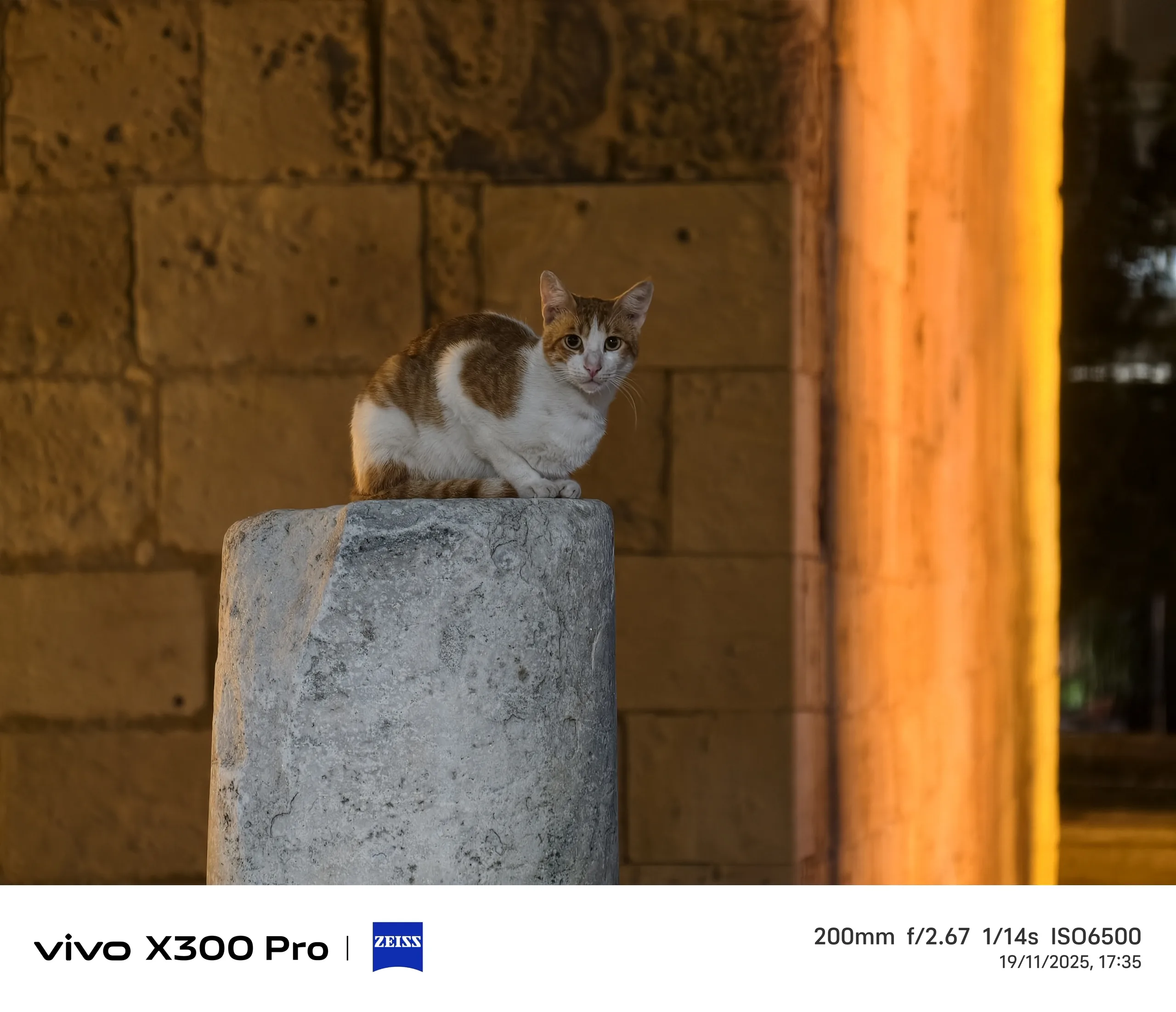 Vivo X300 Pro'nun telekonvertörüyle daha karanlık ortamlarda bile şaşırtıcı bir şekilde daha iyi deneyimler yaşadım, muhtemelen Limasol'daki Lemesos Kalesi'nin korkuluğunda objektifi sabitleyebildiğim için antik sütunun üzerine rahatça yerleşen ama ne yazık ki tek bir pozisyonda kalmayan kediyi fotoğraflayabildim.