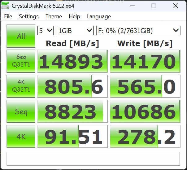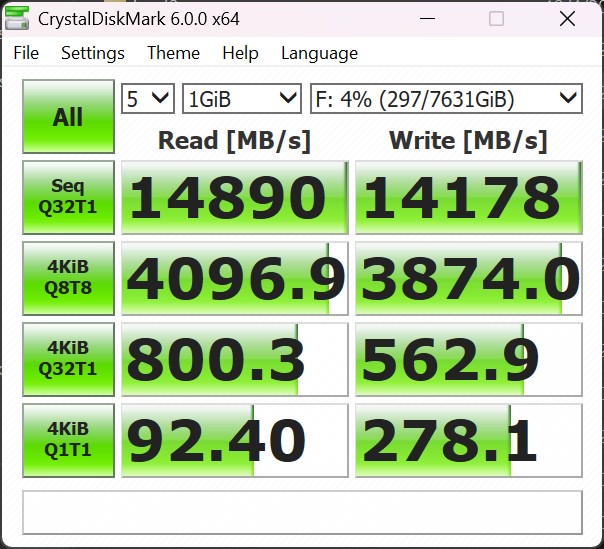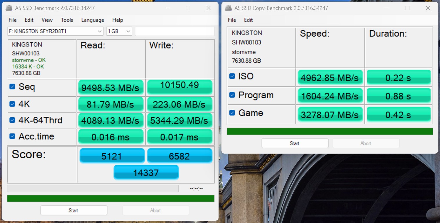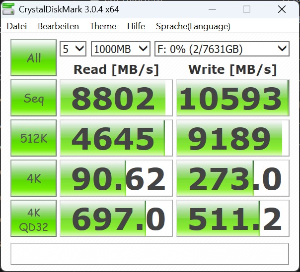 Test sistemimizde, 8 TB'lık Kingston Fury Renegade G5, muazzam performans potansiyelini neredeyse tamamen kullanabilmektedir. CrystalDiskMark 6 karşılaştırmasında 14.900 MB/s üzerinde sıralı okuma hızları ve 14.200 MB/s civarında yazma hızları ölçtük. Beklendiği gibi, AS-SSD kıyaslamasındaki sonuçlar biraz daha düşüktür. Diğer dahili üst seviye SSD'lerle doğrudan karşılaştırıldığında Fury Renegade G5, Samsung 9100 Pro ya da Kingston KC3000 gibi rakip modellerden açık ara öndedir.