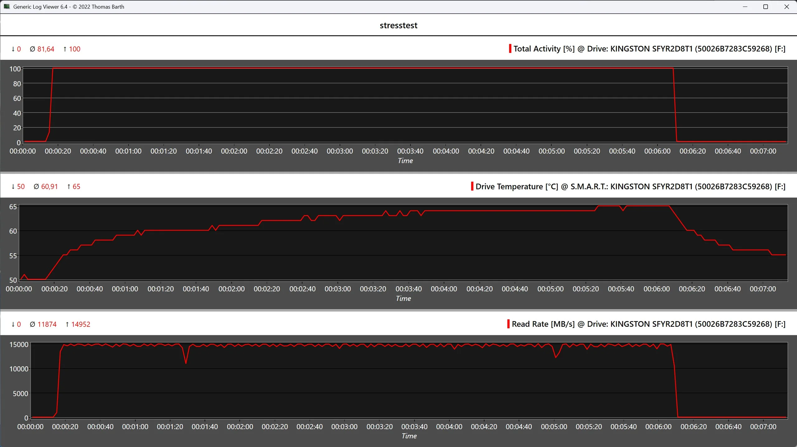Diskspd dayanıklılık testinde de SSD büyük ölçüde sabit performans göstermektedir. Performansta zaman zaman küçük dalgalanmalar olsa da tüm test süresi boyunca önemli bir düşüş yaşanmamıştır. Kingston Fury Renegade G5, ortalama 14.000 MB/sn'den fazla hız ile sürekli yük altında da etkileyicidir. Kingston Fury Renegade G5'in her iki versiyonu da etkileyici performans sunarken, 8 TB modeli, sürekli yük altında biraz daha sabit okuma hızları ile 4 TB versiyonuna göre daha başarılıdır. Ancak bunun için yeterli soğutma gereklidir: Kullanılan ASRock anakartın soğutucu sistemi ile birlikte bu, testte mükemmel bir şekilde çalıştı. Ancak dizüstü bilgisayarlar veya mini PC'ler gibi kompakt sistemlerde, daha yüksek sıcaklıklar sürekli yük altında önemli ölçüde daha büyük performans kayıplarına yol açabilir.