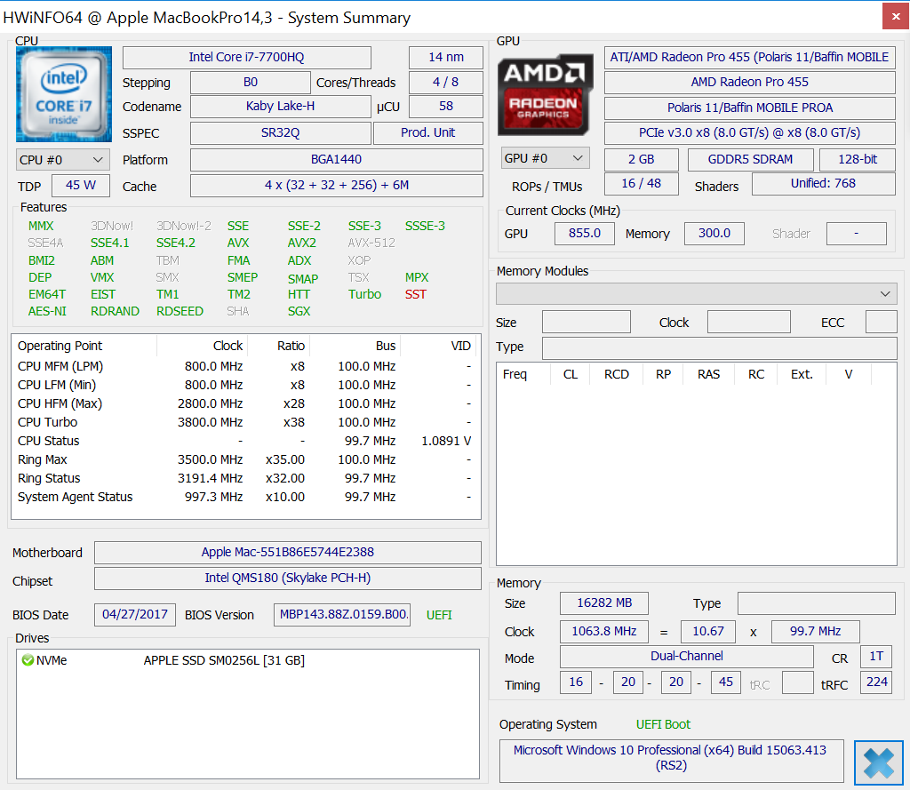 | Apple MacBook Pro 15 2017 (2.8 GHz, 555) Radeon Pro 555, i7-7700HQ, Apple SSD SM0256L | Apple MacBook Pro 15 2016 (2.6 GHz, 450) Radeon Pro 450, 6700HQ, Apple SSD SM0256L | Apple MacBook Pro 15 2016 (2.7 GHz, 455) Radeon Pro 455, 6820HQ, Apple SSD SM0512L | Apple MacBook Pro 15 2016 (2.9 GHz, 460) Radeon Pro 460, 6920HQ, Apple SSD SM1024L | Dell XPS 15 9560 (i7-7700HQ, UHD) GeForce GTX 1050 Mobile, i7-7700HQ, Lite-On CX2-8B512-Q11 | Lenovo ThinkPad P51s 20HB000SGE Quadro M520, i7-7600U, Samsung SSD PM961 1TB M.2 PCIe 3.0 x4 NVMe (MZVLW1T0) | |