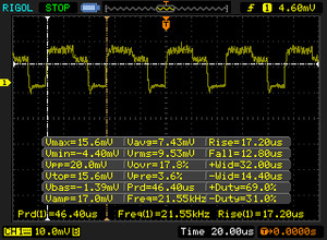 | PWM Frequency (Hz) | 21550 ? | 21000 ? | 19230 ? | 1351 ? | ||