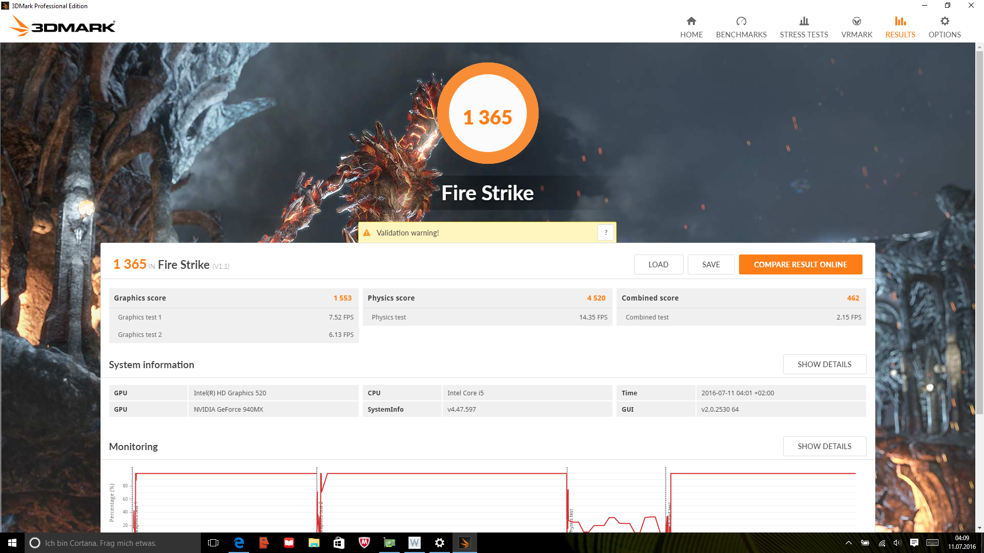 With a recorded temperature of 27 °C (~81 °F) while idling, the chassis remains under 30 °C (~86 °F) in all areas. Under load, the temperature increases to a maximum of 43.4 °C (~110 °F). The hot spots are located on the top in the middle and above the keyboard. During the stress test - which simulates extreme conditions commonly not encountered during normal use - Prime95 and FurMark run in parallel for at least one hour. The CPU tops out at 82 °C ~180 °F) and the GPU at 74°C (~165 °). The processor operates at a constant 2.3 GHz. The Nvidia GeForce 940MX fluctuates minimally between 980 MHz and 1050 MHz. Thermal throttling was not an issue at any time. A repeat of the 3DMark 11 benchmark right after the stress test ended with a score almost identical to the one we recorded after a cold start. In other words: there is no loss of power even when the system operates under full load for prolonged periods of time.