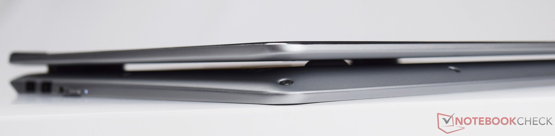 The base as well as the display features beveled chrome edges, which enhance the look without looking obnoxious. The system is very sturdy: the base resists pressure and is torsionally very rigid. The same is true of the display lid, which is very resilient thanks to the materials used. Pressure on the back of the lid does not affect the display at all. The 360-degree hinges hold the display in place well; although there is some slight bouncing in laptop mode - but convertibles generally have this issue. One-handed opening is not possible. The bottom does not feature a maintenance cover, so to swap the SSD or clean the fan, the user has to remove the entire bottom cover. This is easily accomplished once all the tiny screws are removed.