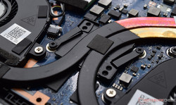 Even though the Yoga 710 lacks a maintenance cover, it is still quite easy to get to the internal components. After removing the entire bottom base unit cover, the user has access to the SSD, the RAM, the cooling fans, and the battery. The RAM is located underneath a metal shield to protect it further. Expandability is restricted to upgrades, since all slots are occupied.