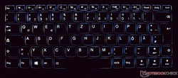 The chiclet keyboard has been integrated directly into the upper part of the base unit. The individual keys sit tightly, so they do not clatter while typing. There is no dedicated number block, which is not necessarily a disadvantage, since the keys are quite large at 17 x 17 mm (~0.7 x 0.7 in) with about 2 mm (~0.1 in) of space between them. The keyboard appears to be well thought-out and the lettering is easy to read - even the symbols on the smaller F keys do not make the keys look cluttered. The keystroke is slightly softer compared to other convertibles and the keyboard noise is well controlled and not obtrusive. The keyboard does not flex at all while typing. The subtle white backlight - which offers two adjustment levels in addition to off - is particularly pleasing.